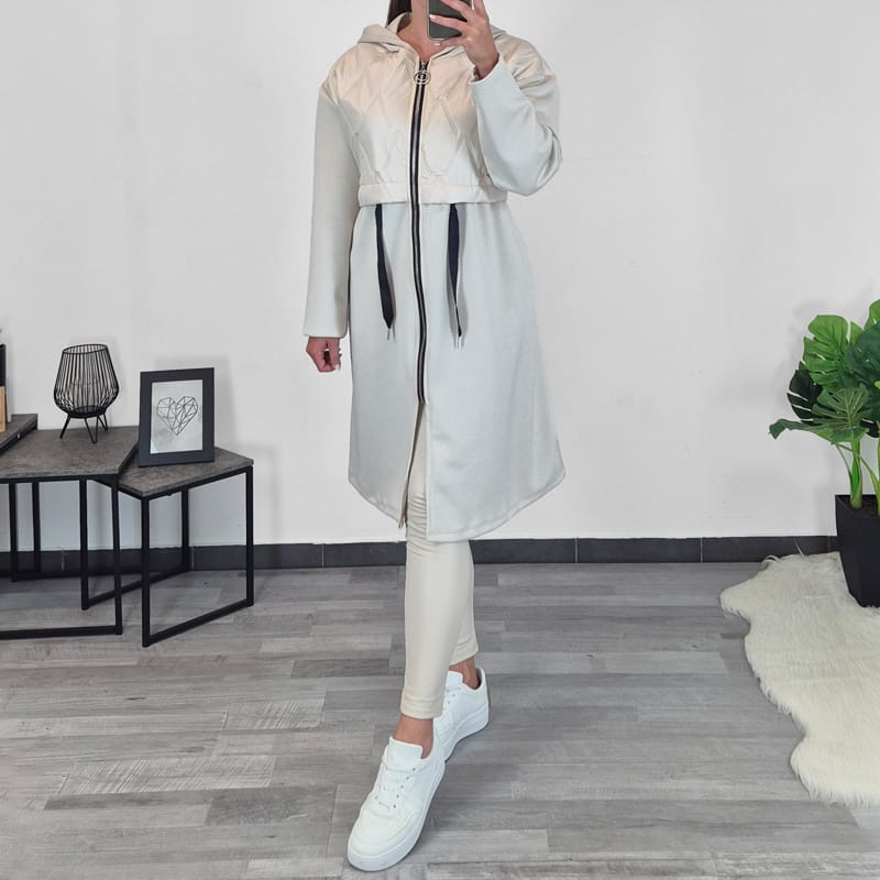 Ženska jopa v bež barvi. Jakna ima kapuco, posebno zanimiv izgled ji daje kombinacija prešite bunde v zgornjem delu. V pasu ima vrvico, s katero lahko jakno oblikujete po svojem telesu. Velikost je univerzalna, primerrna za M do XXL.