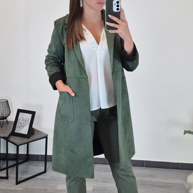 Ženska daljša elegantna jakna v olivno zeleni barvi. Jakna ima dolga rokava. Narejena je iz mehkega materiala, ki se ne mečka. Velikost je univerzalna, primerna za S, M, L, XL.