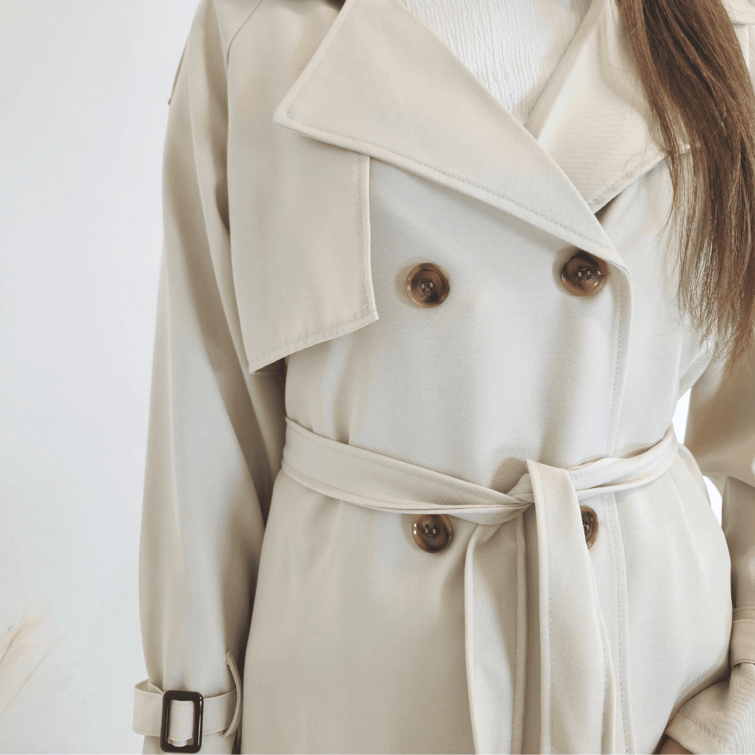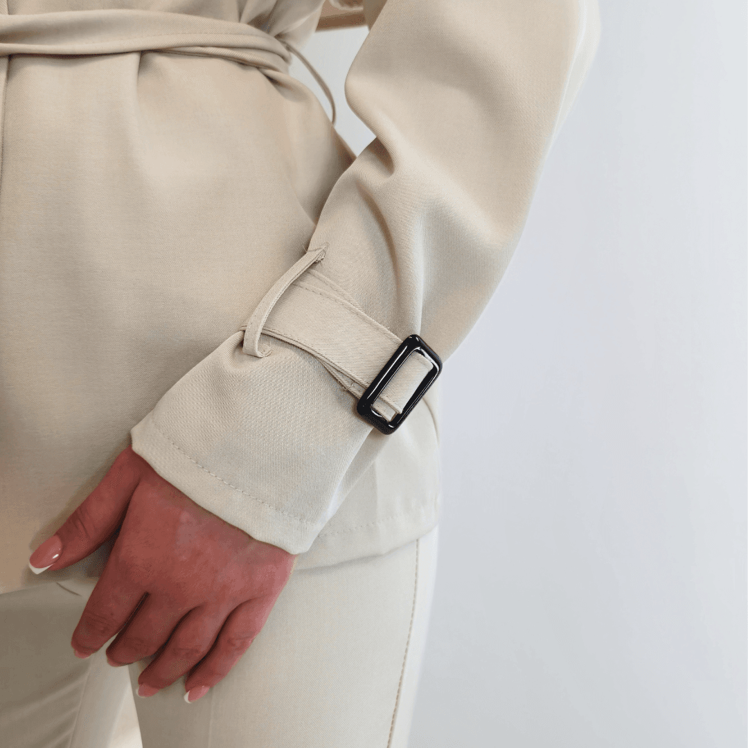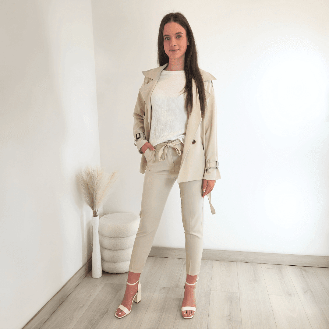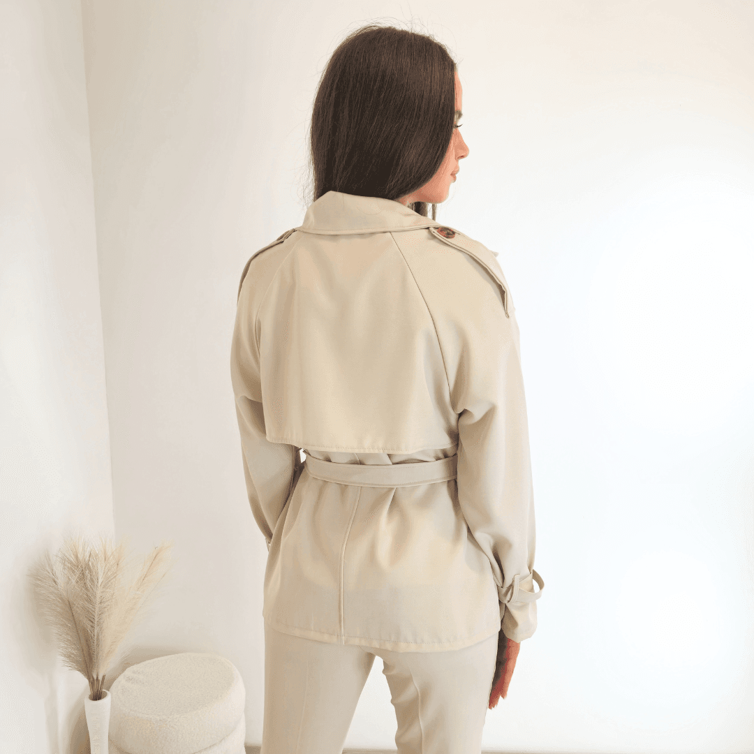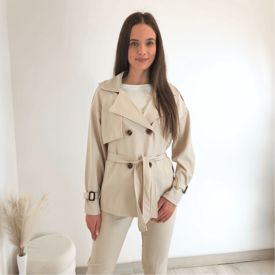 Ženska elegantna jakna v bež barvi. Jakna ima ovratnik, zapenja se na gumbe in se zaveže s pasom. Na koncu rokava je dodan trak s katerim lahko nastavite širino. Velikost je univerzalna, primerna za velikosti od S do XL.