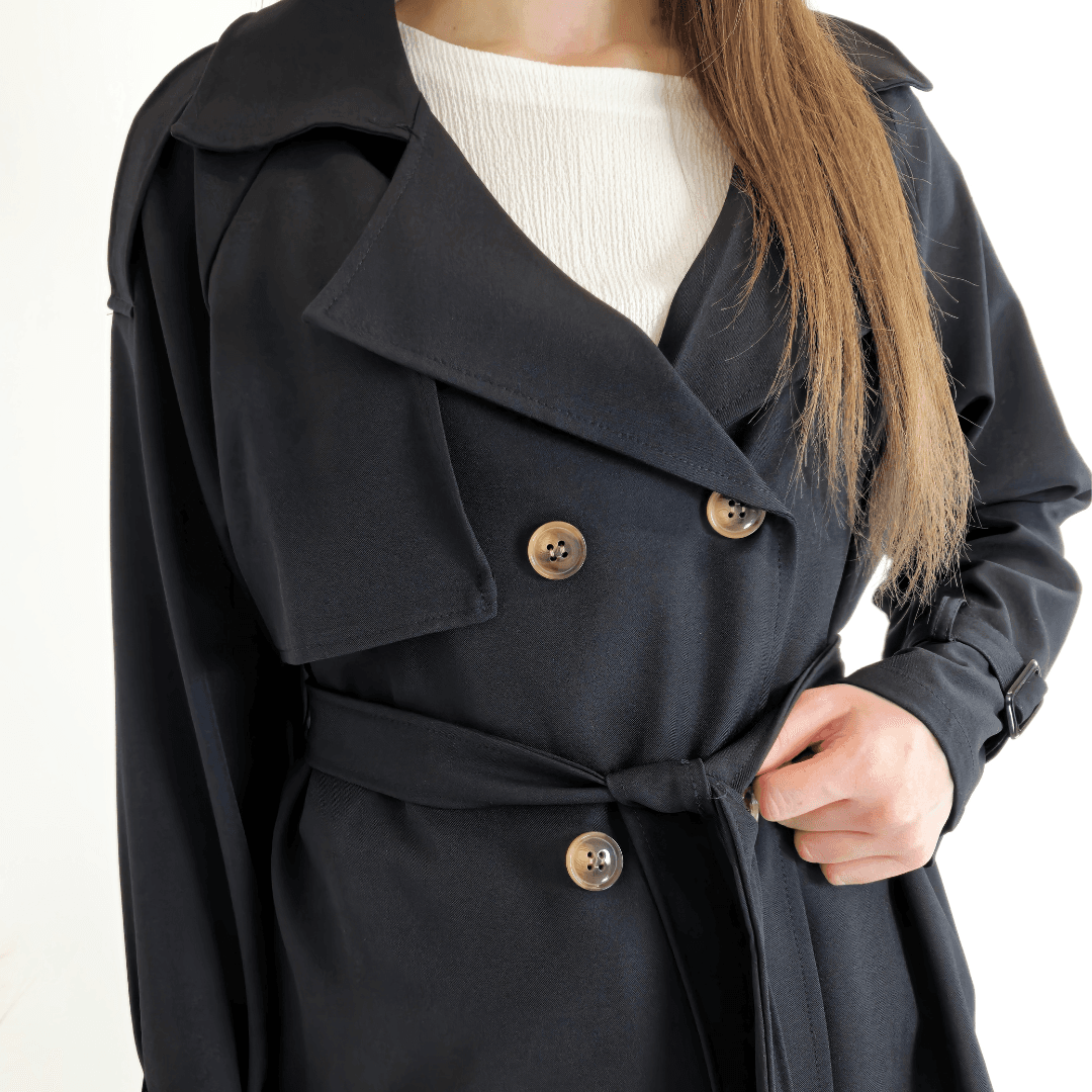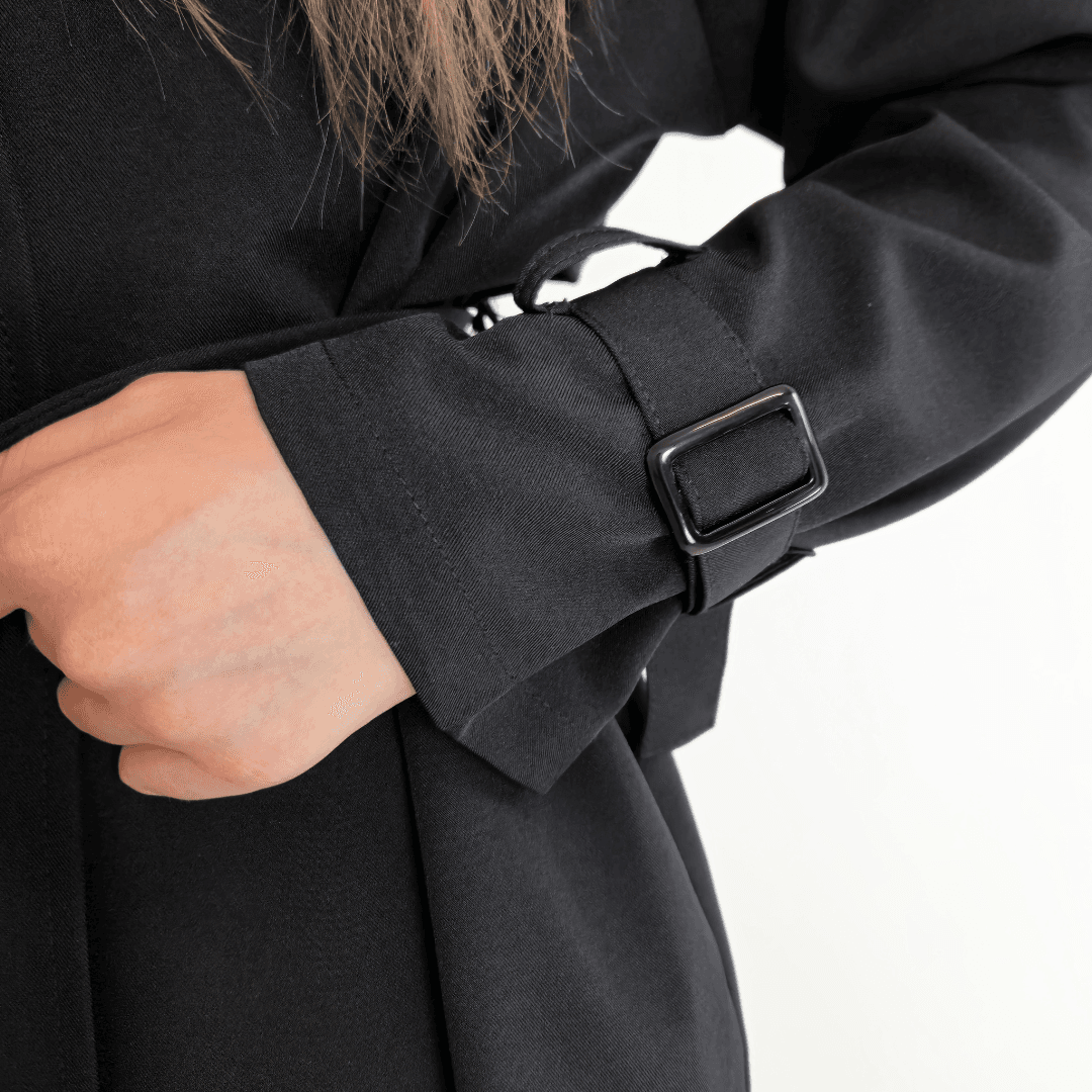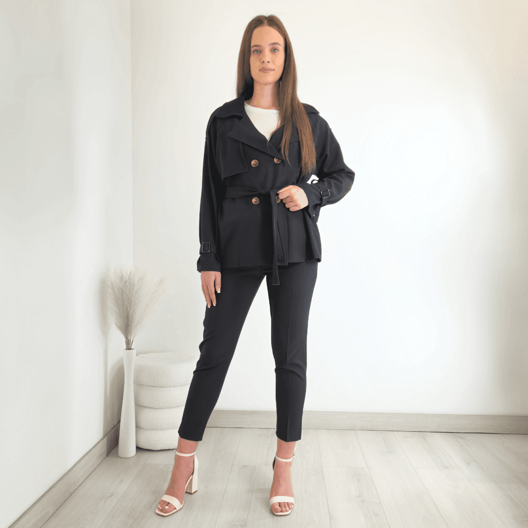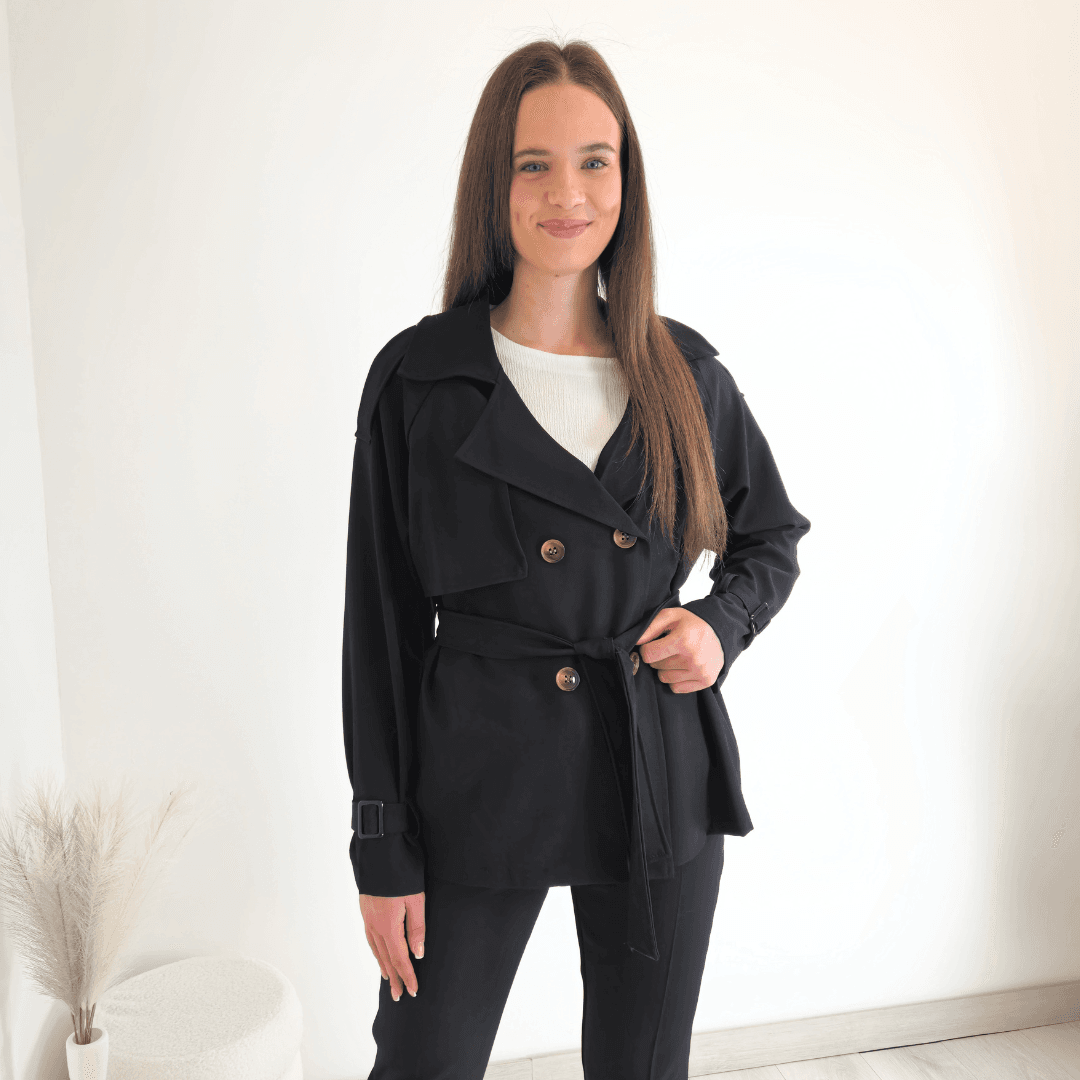 Ženska elegantna jakna v črni barvi. Jakna ima ovratnik, zapenja se na gumbe in se zaveže s pasom. Na koncu rokava je dodan trak s katerim lahko nastavite širino. Velikost je univerzalna, primerna za velikosti od S do XL.