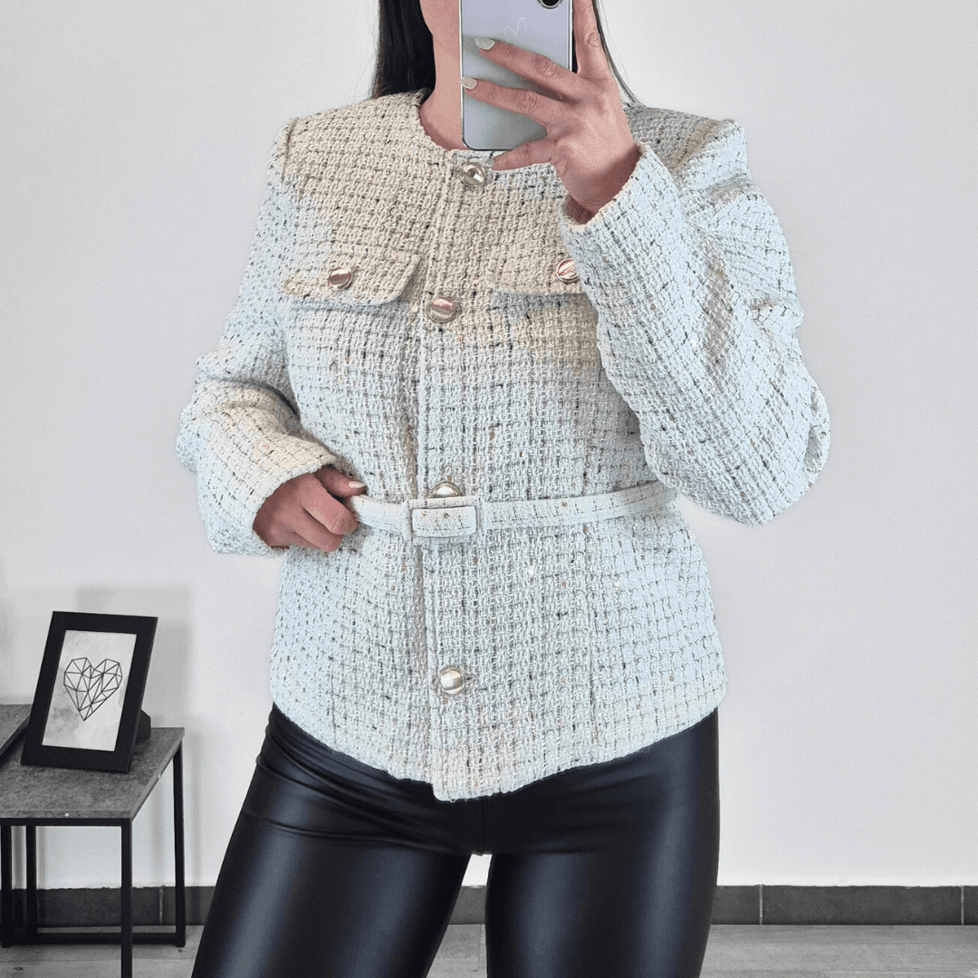 Ženska elegantna jakna v bež barvi. Jakna se zapenja z gumbi. Dodan je pas, spodaj ima podlogo. Žepa spredaj sta dekorativna. Na voljo je v velikostih od S do L.
