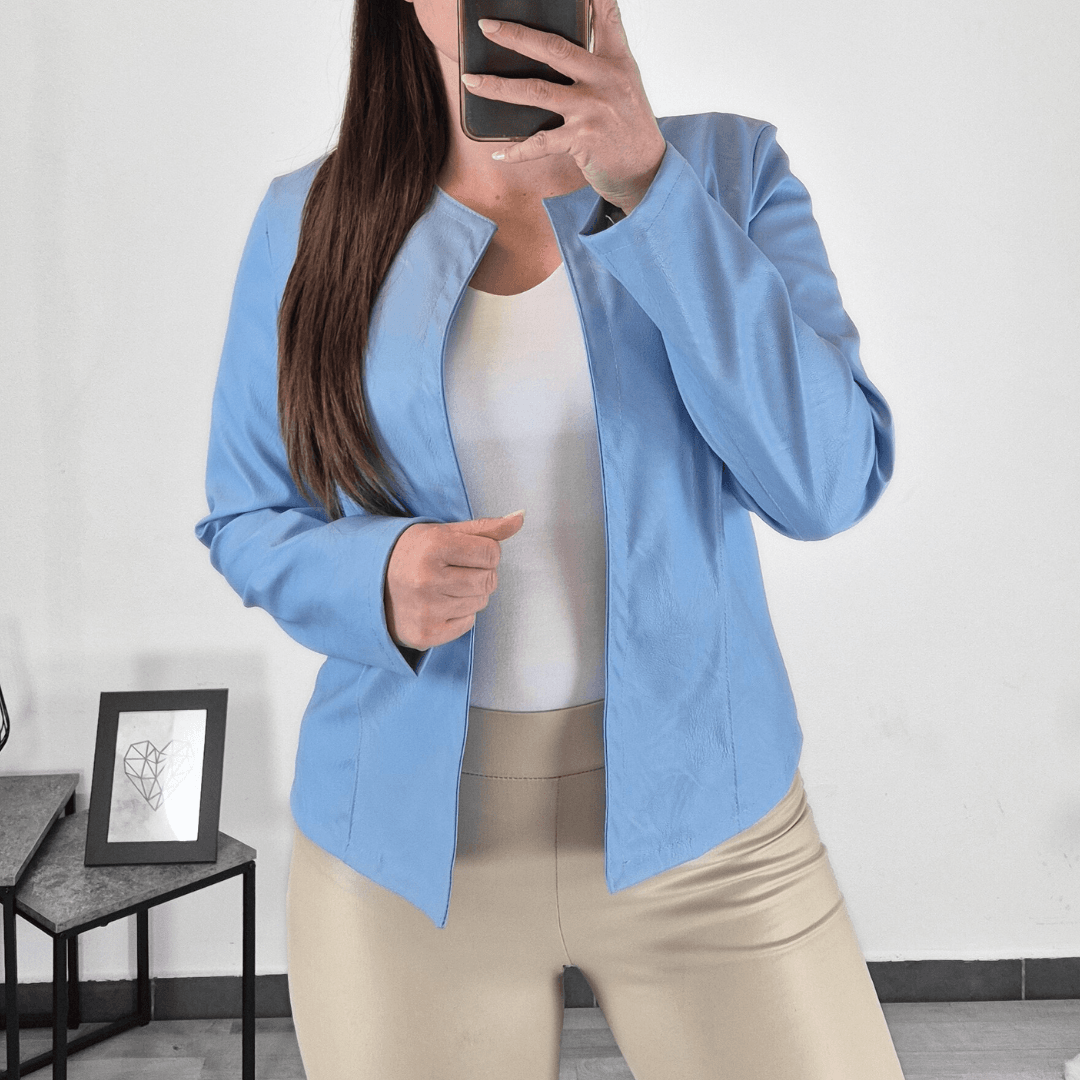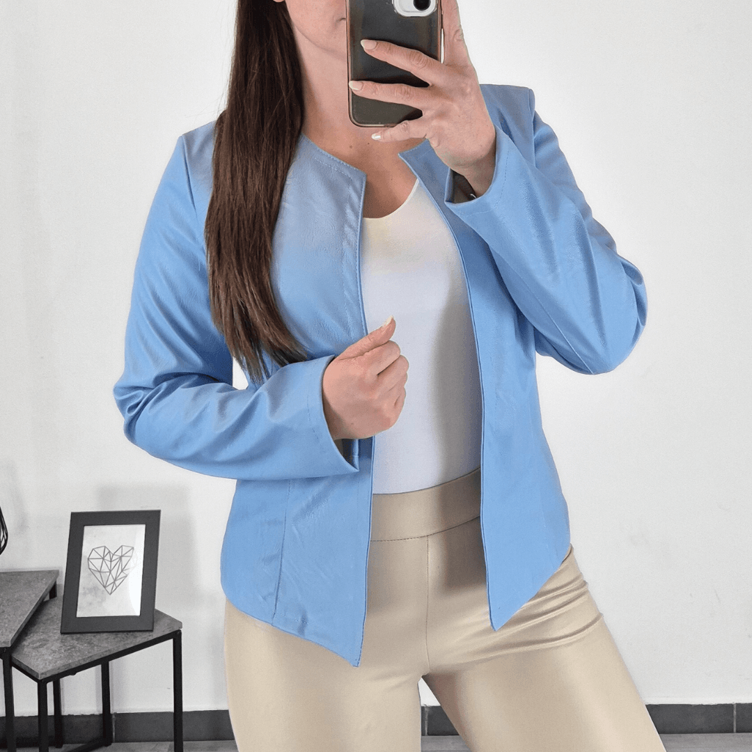 Ženska jakna v svetlo modri barvi. Kroj jakne je krajši in se ne zapenja. Izdelana je iz umetnega usnja. Jakna je na voljo od številke S do številke XXL.