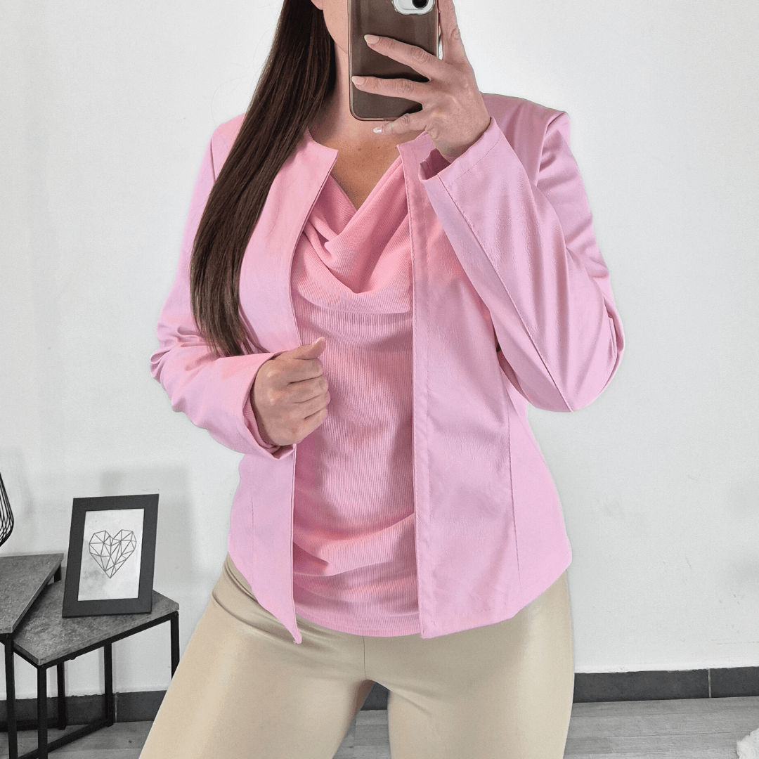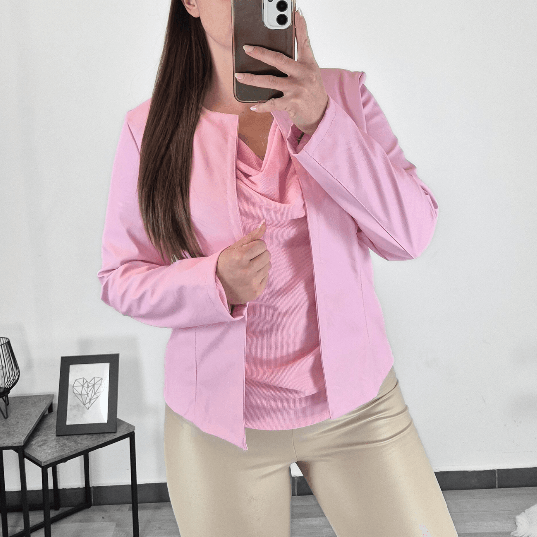Ženska jakna v roza barvi. Kroj jakne je krajši in se ne zapenja. Izdelana je iz umetnega usnja. Jakna je na voljo od številke S do številke XXL.