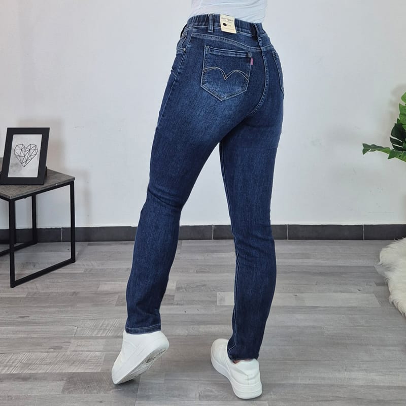 Ženski temnejši jeans v pasu z elastiko. Hlače so elastične in udobne za nošenje. Imajo dva žepa na sprednji strani in dva žepa na zadnji strani. Hlače boste odlično kombinirale s svojimi najljubšimi oblačili.