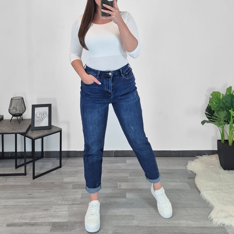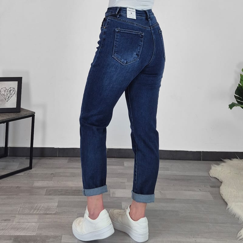 Ženske momfit hlače v temni jeans barvi. Hlače so elastične in so udobne za nošenje. Zapenjajo se z gumbom in zadrgo, na sprednji in zadnji strani imajo dva žepa. Hlače so v pasu oprijete, po nogah pa so malenkost širše. Končna dolžina odvihane hlačnice od razkoraka, pri velikosti 38, je 67 cm.