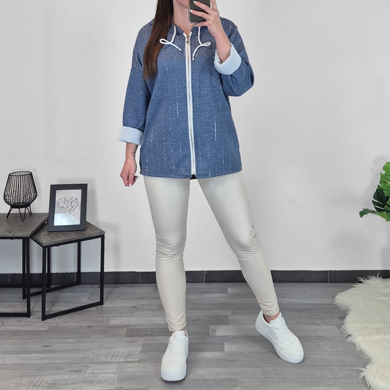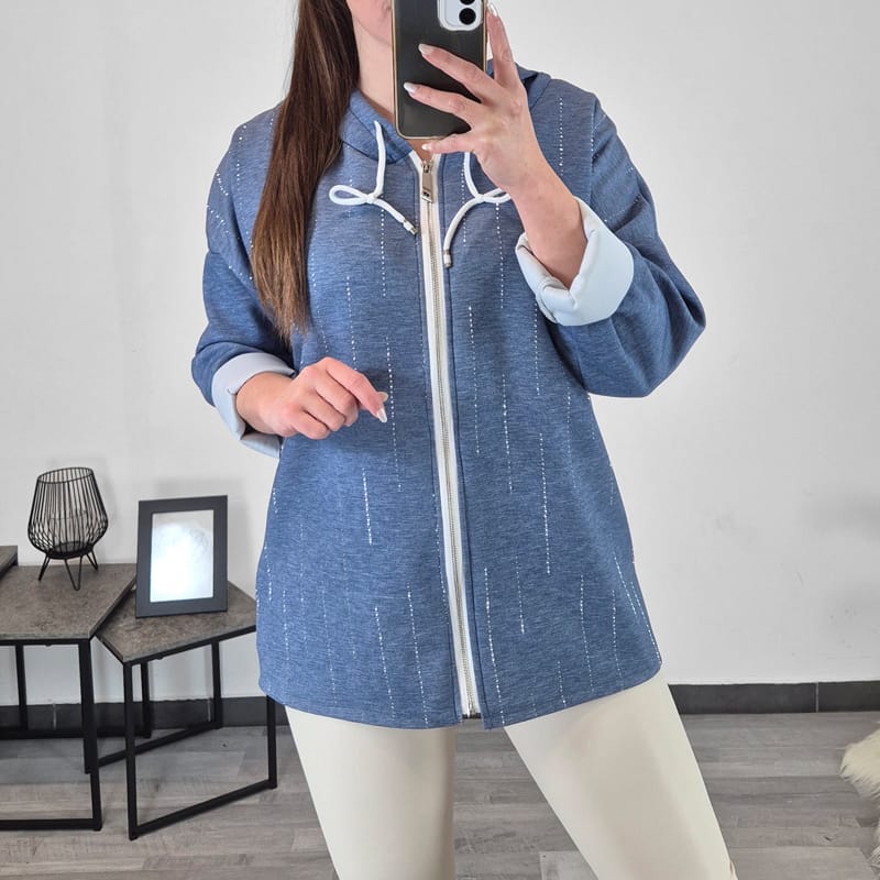 Ženska jopa s kapuco v jeans modri barvi. Kroj jope je širši in zadaj nekoliko podaljšan. Na sprednji strani jopo krasijo dodani svetleči kamenčki, kar jopi daje posebno zanimiv izgled. Velikost je univerzalna in je primerna za velikosti od M do XXL.