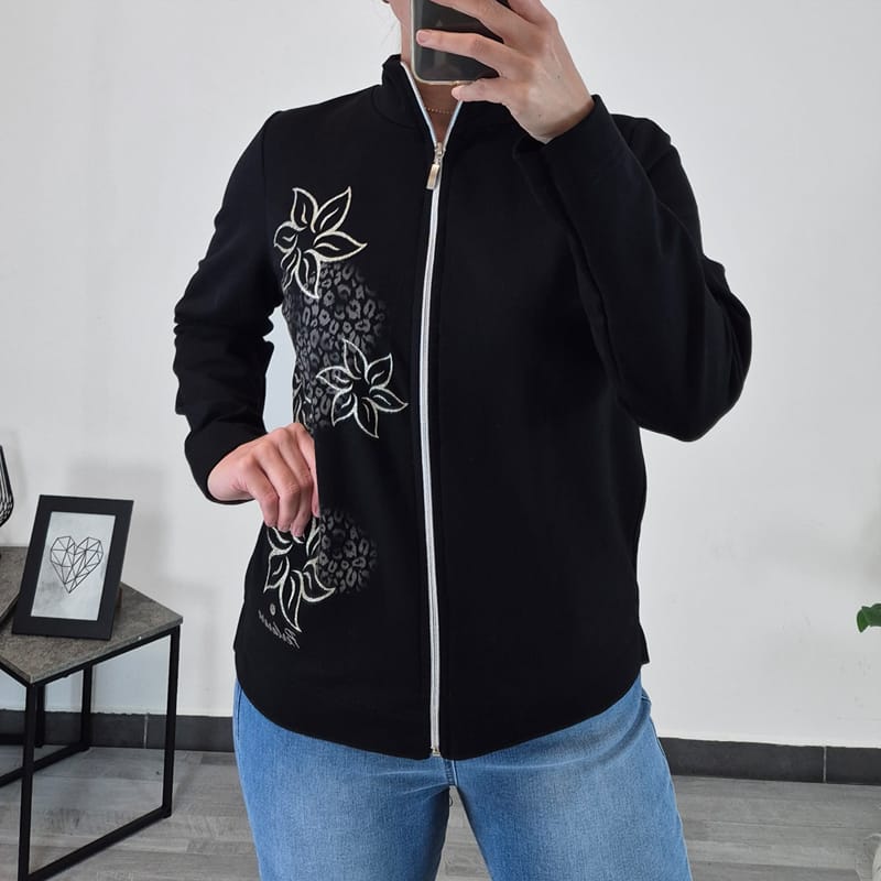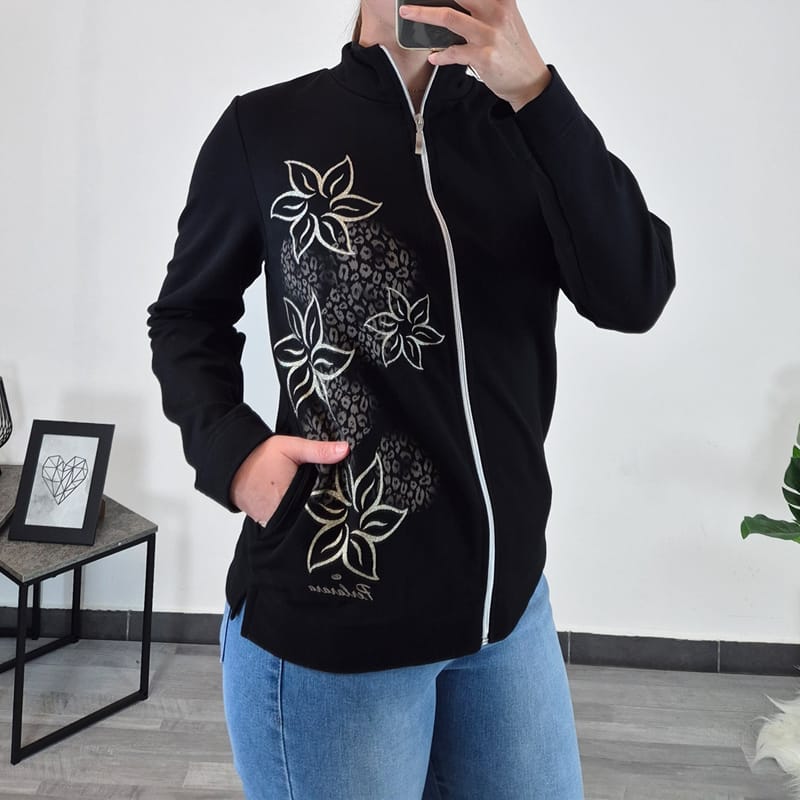 Ženska jopa v črni barvi. Spredaj ima tisk v rjavi barvi in zlatimi rožami. Jopa ima visok ovratnik, po celotni dolžini se zapenja z zadrgo, dodana ima dva žepa. Narejena je iz bombaža, je elastična in udobna. Jopa je kosmatena, primerna za hladnejše dni.