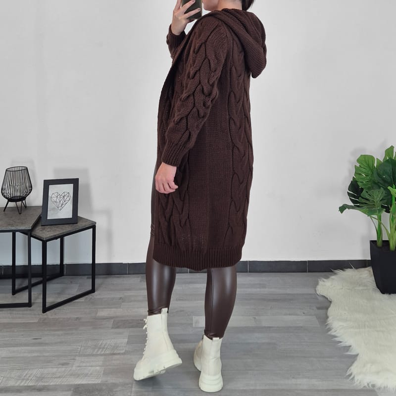 Modna ženska jopa v rjavi barvi. Jopa je daljša in je za ogrnit (brez gumbov ali zadrge). Ima dolga rokava in kapuco. Velikost je univerzalna, primerna za S do L.