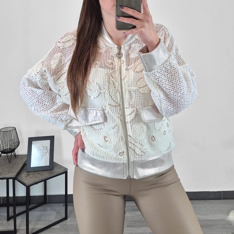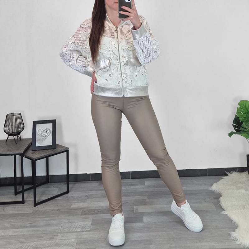Tanka pletena ženska jopa v zlato bež barvni kombinaciji. Jopa ima zadrgo, spodaj in na rokavu se zaključuje s patentom. Na sprednji strani so žepi samo nakazani. Jopa je univerzalne velikosti, primerna za S do XL.