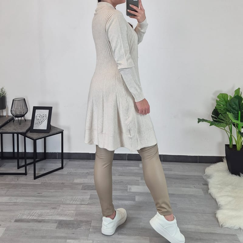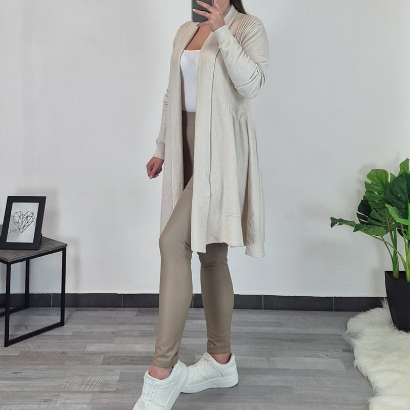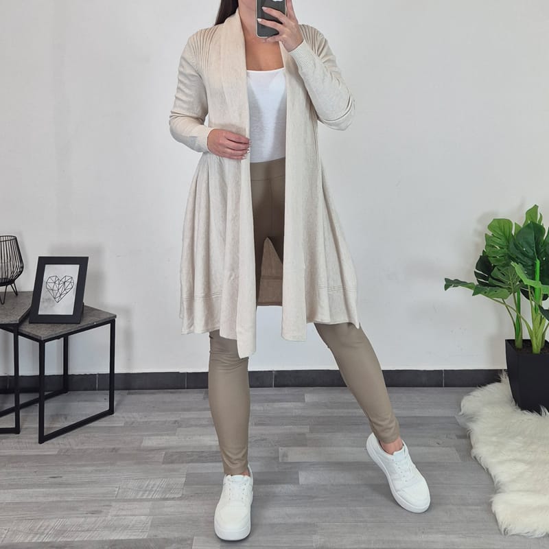 Elegantna daljša pletena jopa v bež barvi.