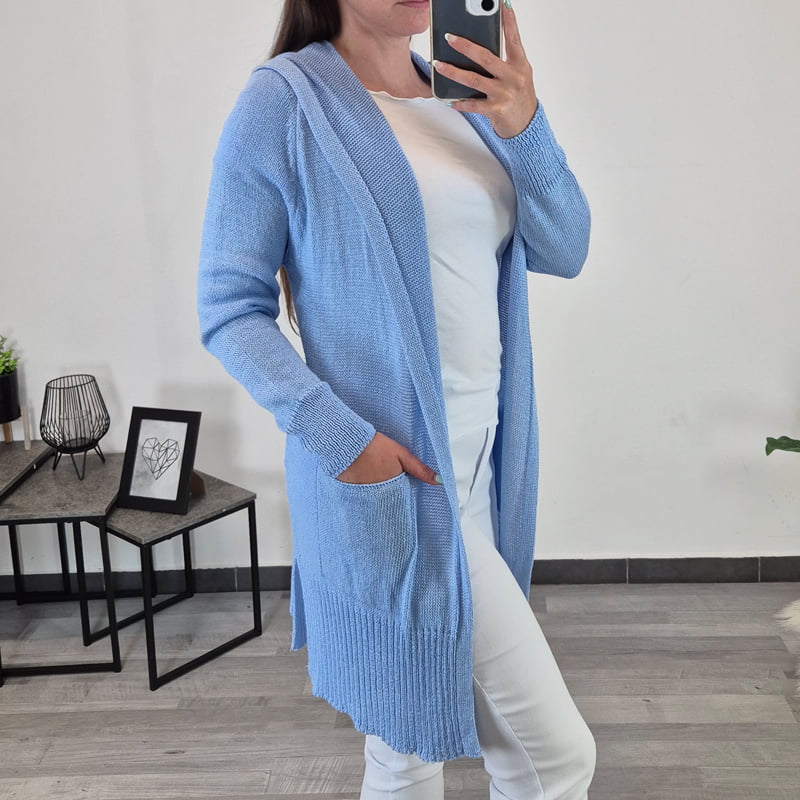 Ženska jopa je narejena iz tanke pletenine, primerna je za pomladne dni. Jopa je v svetlo modri barvi, ima kapuco in žepe. Velikost je univerzalna, primerna za velikosti od S/36 do XL/42.