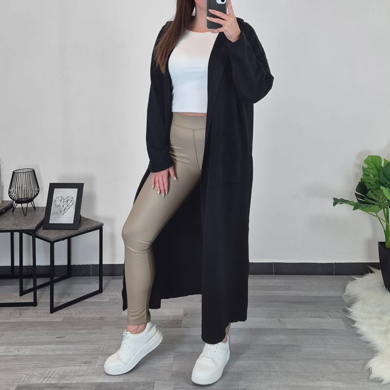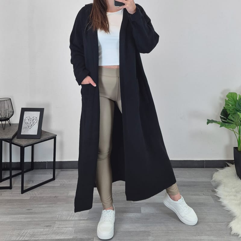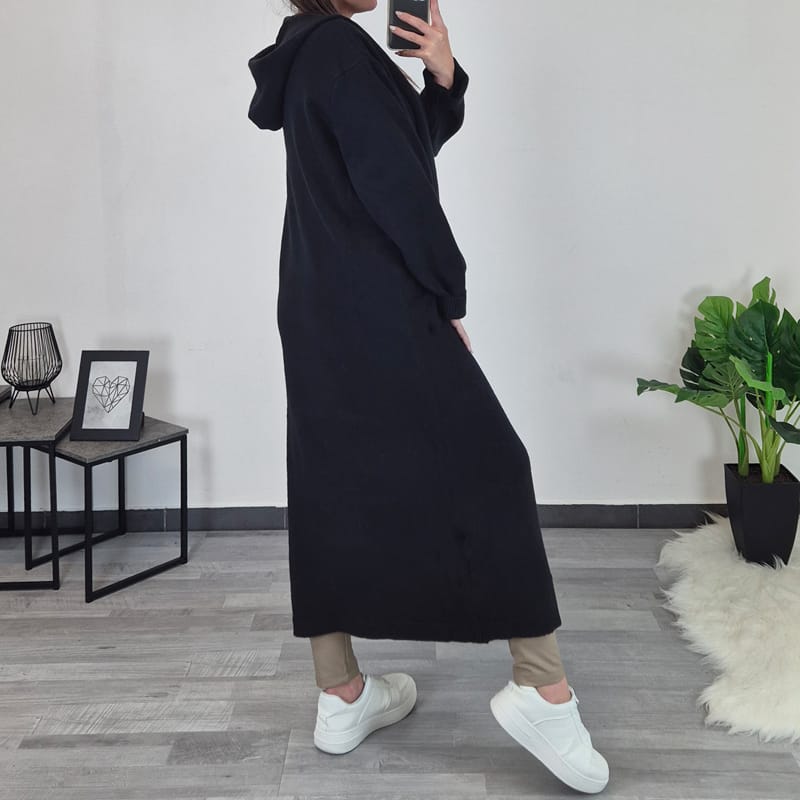 Modna oversize ženska jopa v črni barvi. Jopa je za ‘ogrnit’ (je brez gumbov ali zadrge), je dolga in ima kapuco. Na sprednji strani ima prišita dva žepa. Velikost je univerzalna, primerna za velikosti od S do XXL. V primeru, da nosite velikost S, jopa izgleda oversize, v primeru da nosite XXL pa jopa izgleda bolj oprijeta.