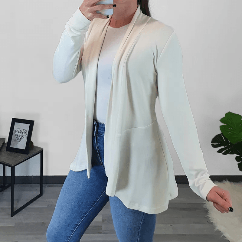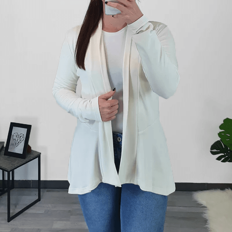 Elegantna ženska viskozna jopica v barvi smetane. Jopica ima dolga rokava, kroj pa je malo daljši in lepo pade preko bokov. Jopica je brez zadrge in je lahko odlična kombinacija s pisanimi ali enobarvnimi majicami. Izdelana je iz kvalitetne viskoze. Na voljo je od številke 36 pa do številke 48.
