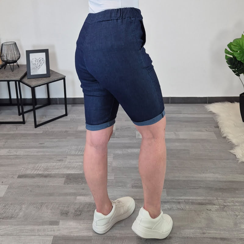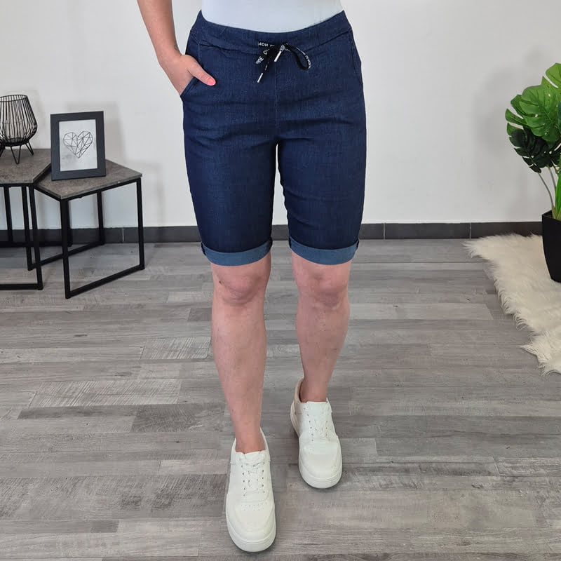 Ženske kratke hlače z elastiko v pasu. Hlače so v temno modri barvi v videzu jeansa. Imajo dva stranska žepa, v pasu je dodana še vrvica. Narejene so iz zelo tankega in elastičnega materiala in so udobne.