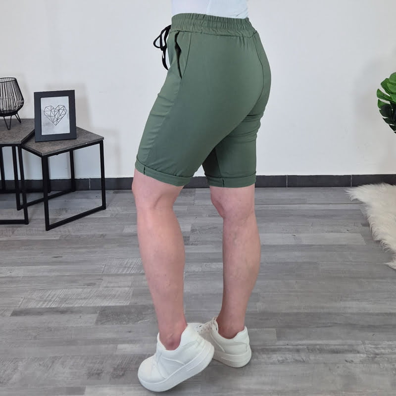 Ženske kratke hlače z elastiko v pasu, v olivno zeleni barvi. Imajo dva stranska žepa, v pasu je dodana še vrvica. Narejene so iz zelo elastičnega materiala in so udobne.