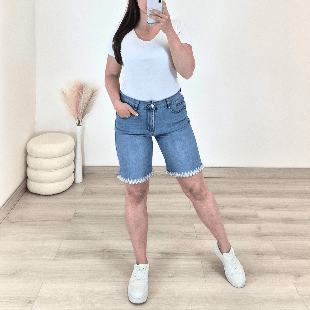 Ženske push up kavbojke. Hlače so kratke, izdelane iz kvalitetnega bombaža in so zelo elastične ter udobne za nošenje. Imajo višji pas, zapenjajo se na gumb in zadrgo, imajo dva žepa na sprednji strani in dva žepa na zadnji strani. Na hlačnicah je dodano vezenje. Hlače boste odlično kombinirale s svojimi najljubšimi oblačili. Svetujemo nakup manjše številke.