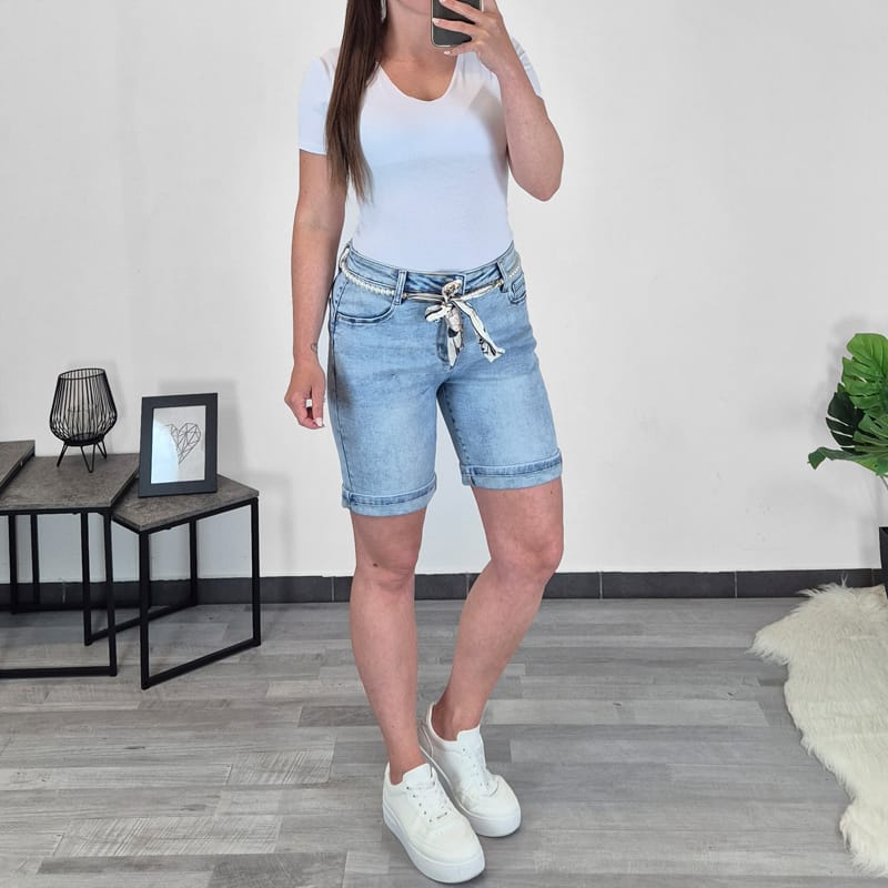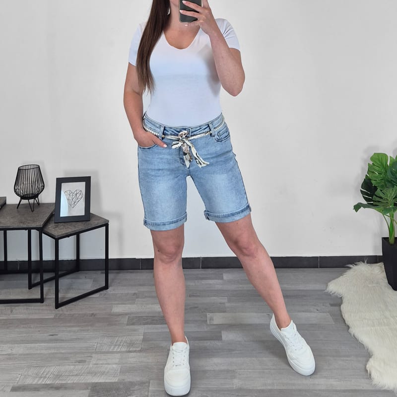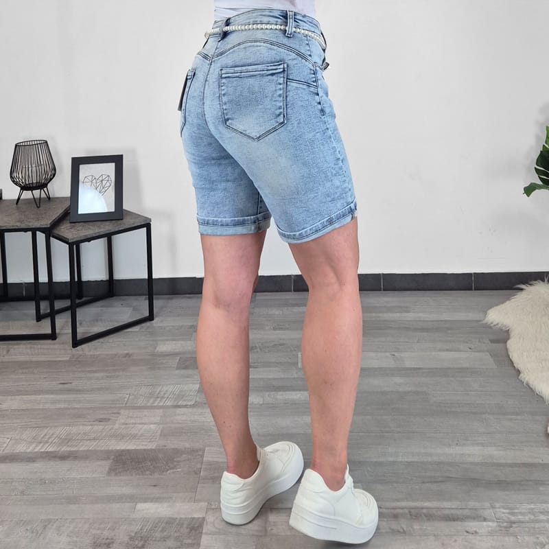 Ženske push up kavbojke. Hlače so kratke, izdelane iz kvalitetnega bombaža in so zelo elastične ter udobne za nošenje. Imajo višji pas, zapenjajo se na gumb in zadrgo, imajo dva žepa na sprednji strani in dva žepa na zadnji strani. Dodan imajo pas iz perlic. Hlačnice so zavihane, po želji jih lahko odvihate. Hlače boste odlično kombinirale s svojimi najljubšimi oblačili.