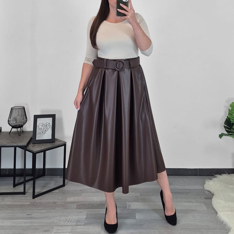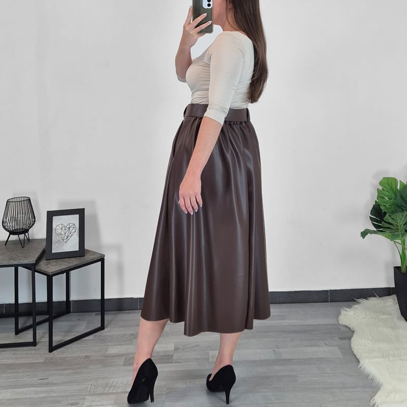 Žensko krilo v rjavi barvi. Narejeno je iz umetnega usnja. Krilo je daljše, ima elastičen pas, dodan je še dekorativen pas v enaki barvi. Na zadnji strani je v pasu elastika. Velikost je univerzalna, primerna za velikosti S, M, L.