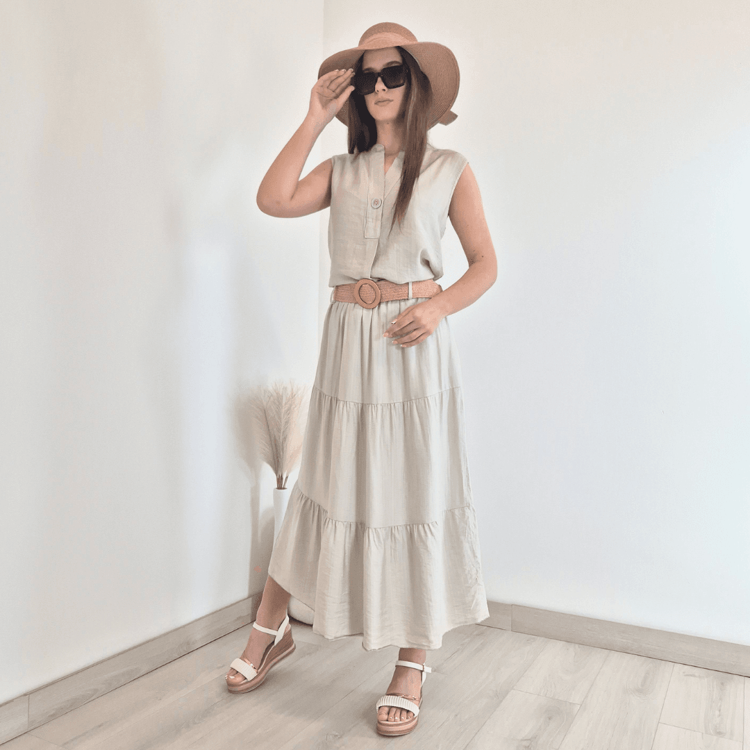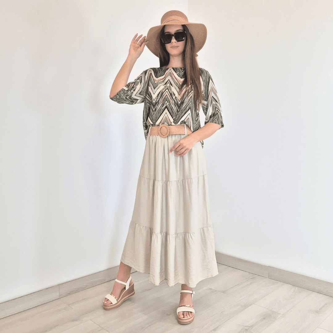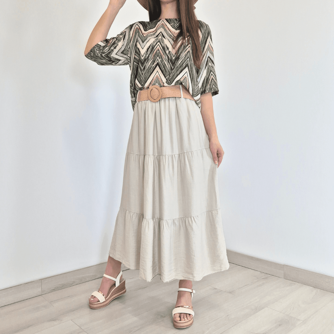 Modno krilo iz kolekcije Violeta v bež barvi. Krilo je izdelano iz viskoze, je lahko in zračno, odlično za poletne dni. Priložen je dekorativni pas. Velikost je univerzalna, primerna za S do XL. Vse kose iz kolekcije Violeta lahko med sabo lepo kombinirate.
