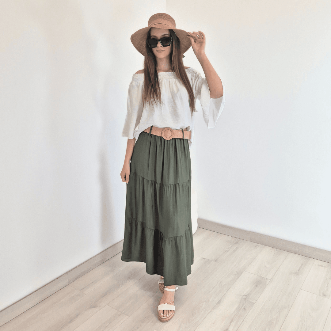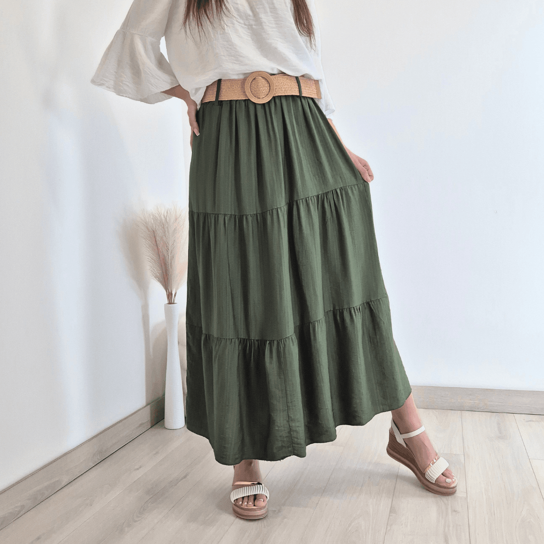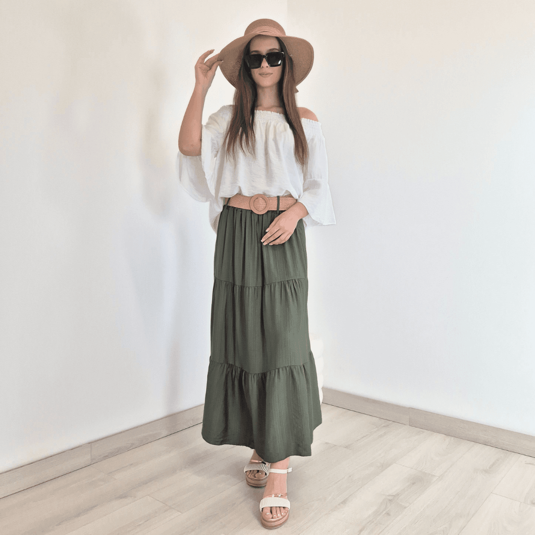 Modno krilo iz kolekcije Violeta v olivno zeleni barvi. Krilo je izdelano iz viskoze, je lahko in zračno, odlično za poletne dni. Priložen je dekorativni pas. Velikost je univerzalna, primerna za S do XL. Vse kose iz kolekcije Violeta lahko med sabo lepo kombinirate.