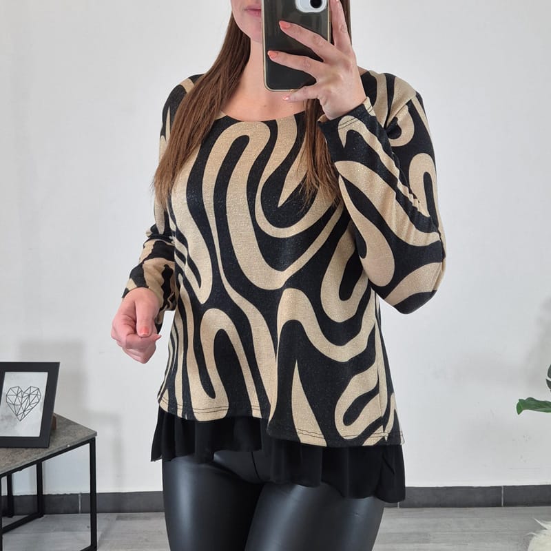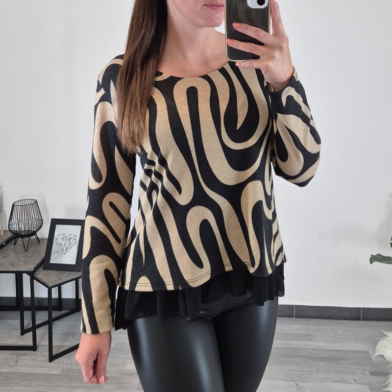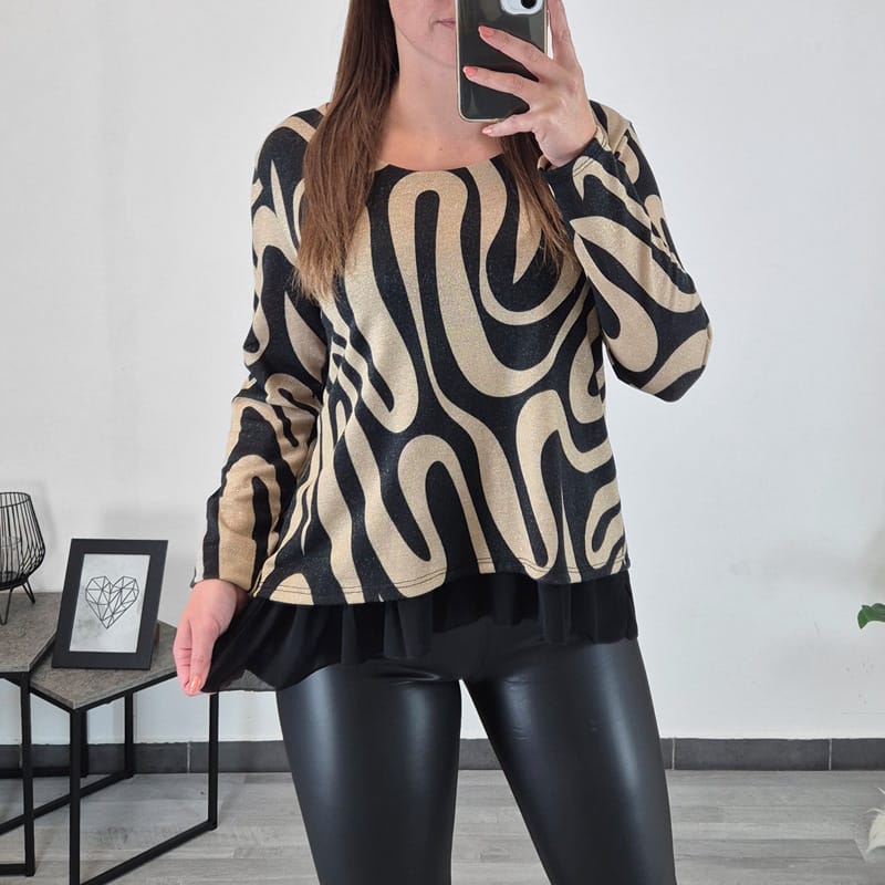 Ženska elegantna majica z vzorcem. Majica je v kombinaciji bež in črne barve z zlato nitko, na spodnjim delu je dodan til v črni barvi, kar ji ustvari bolj eleganten videz. Rokava so dolga, lahko jih tudi zavihate, dolžino lahko po želji prilagodite. Velikost je univerzalna, ustreza velikostim od S do L.
