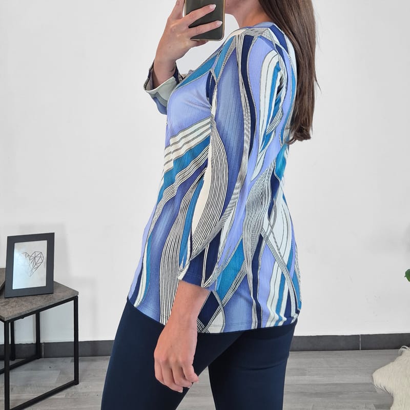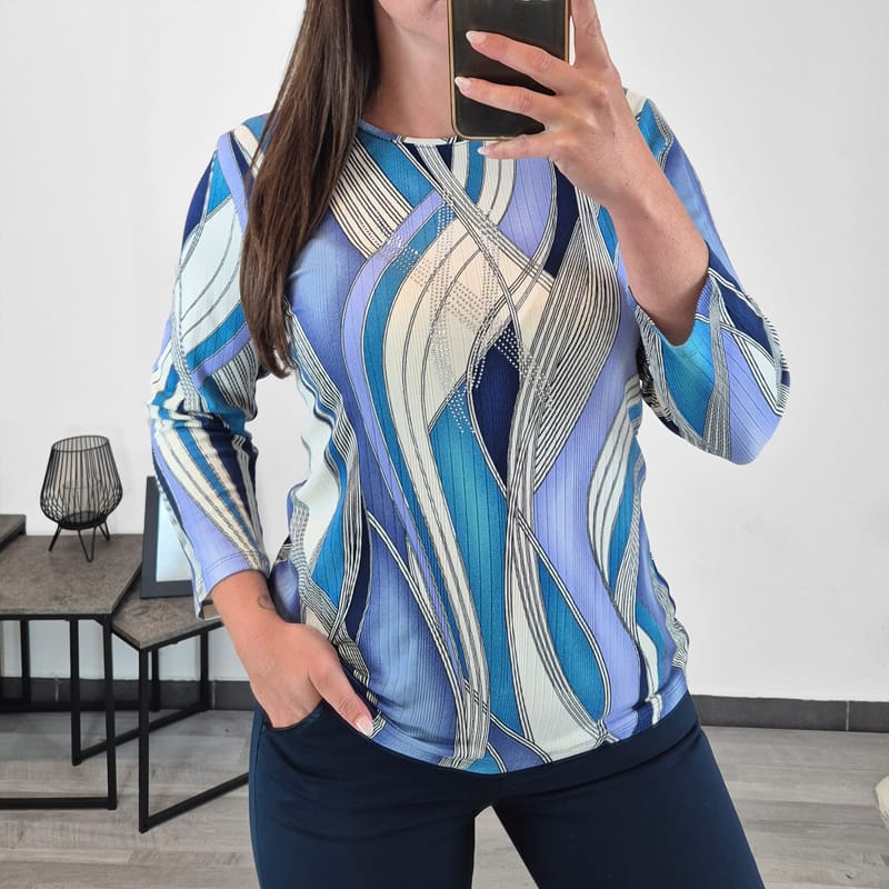 Ženska pisana viskozna majica z dolgimi rokavi. Narejena je iz visokokvalitetne viskoze, zato je prijetna za nošenje. Majica ima pisan vzorec v beli in modri barvi. Spredaj jo krasijo majhne bleščice. Na voljo je od številke 36 do 48.