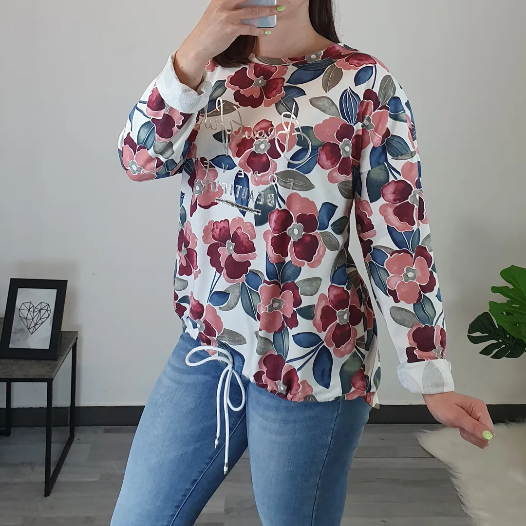 Ženska majica s pisanim vzorcem in dolgimi rokavi. Kroj majice je širši, na spodnjem delu ima vrvico s katero majico oblikujete. Velikost je univerzalna, primerna za velikosti od M do XXL.