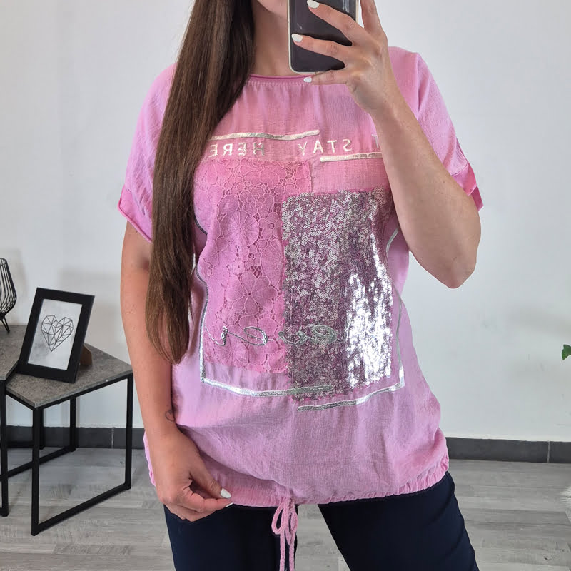 Ženska majica s kratkimi rokavi je narejena iz tankega bombaža in je primerna tudi za vroče dni. Kroj majice je širši, na spodnjem delu ima vrvico s katero majico oblikujete. Velikost je univerzalna, primerna za velikosti od L do XXL.