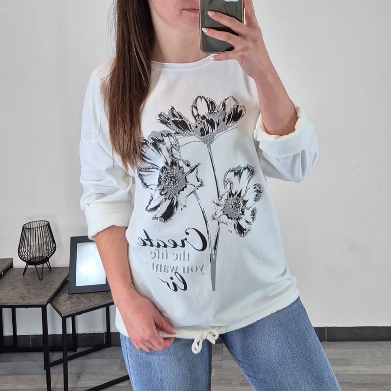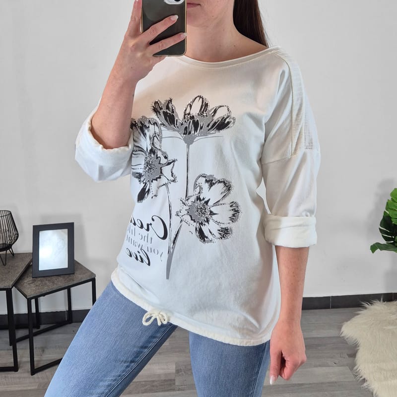 Modna ženska majica v beli barvi s tiskom. Ima dolga rokava s spuščenimi rameni. Na zadnji strani je podaljšana in lepo pokrije zadnjico. Na spodnji strani je dodana vrvica, s katero lahko širino nastavite po želji. Velikost je univerzalna, primerna za velikosti od od L do 4XL