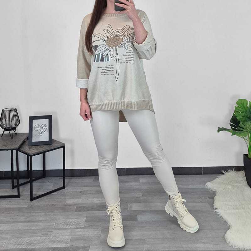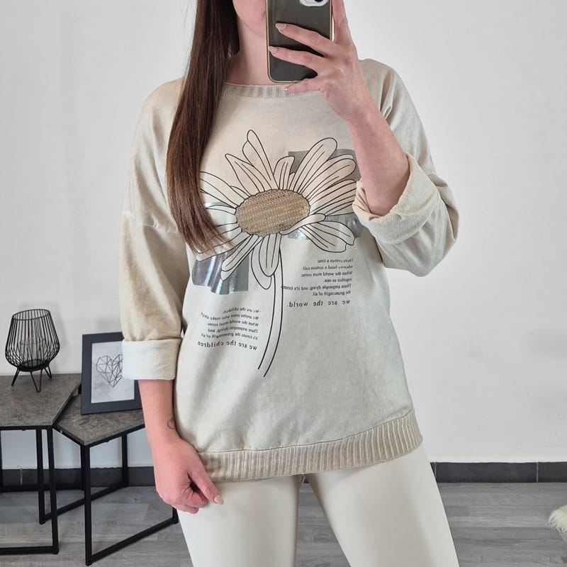 Modna ženska majica v bež barvi s tiskom. Majica ima dolga rokava s spuščenimi rameni. Na zadnji strani je podaljšana in lepo pokrije zadnjico. Na spodnji strani je dodan patent. Velikost je univerzalna, primerna za velikosti od L do 4XL