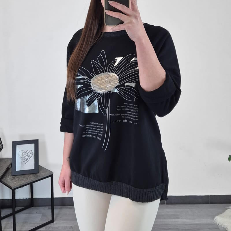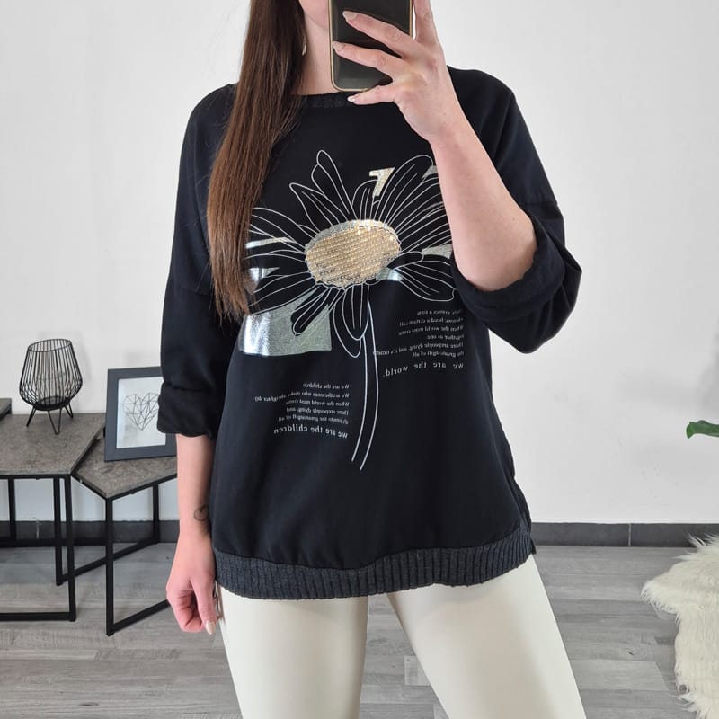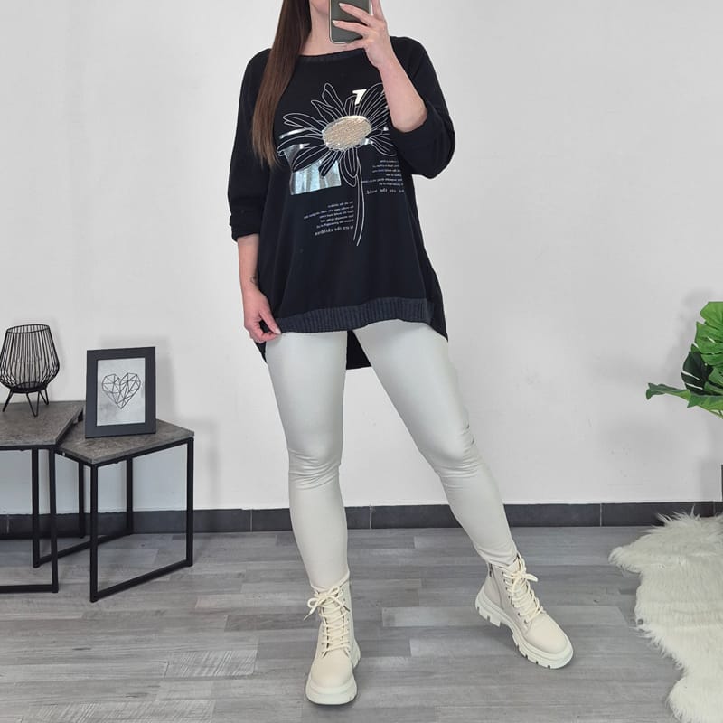 Modna ženska majica v črni barvi s tiskom. Majica ima dolga rokava s spuščenimi rameni. Na zadnji strani je podaljšana in lepo pokrije zadnjico. Na spodnji strani je dodan patent. Velikost je univerzalna, primerna za velikosti od L do 4XL