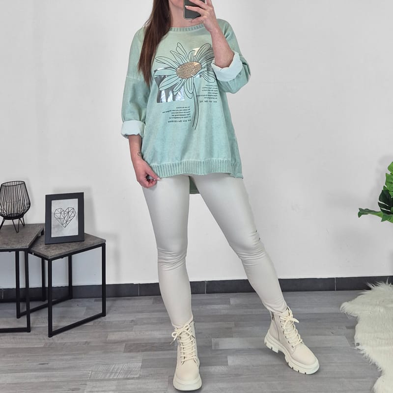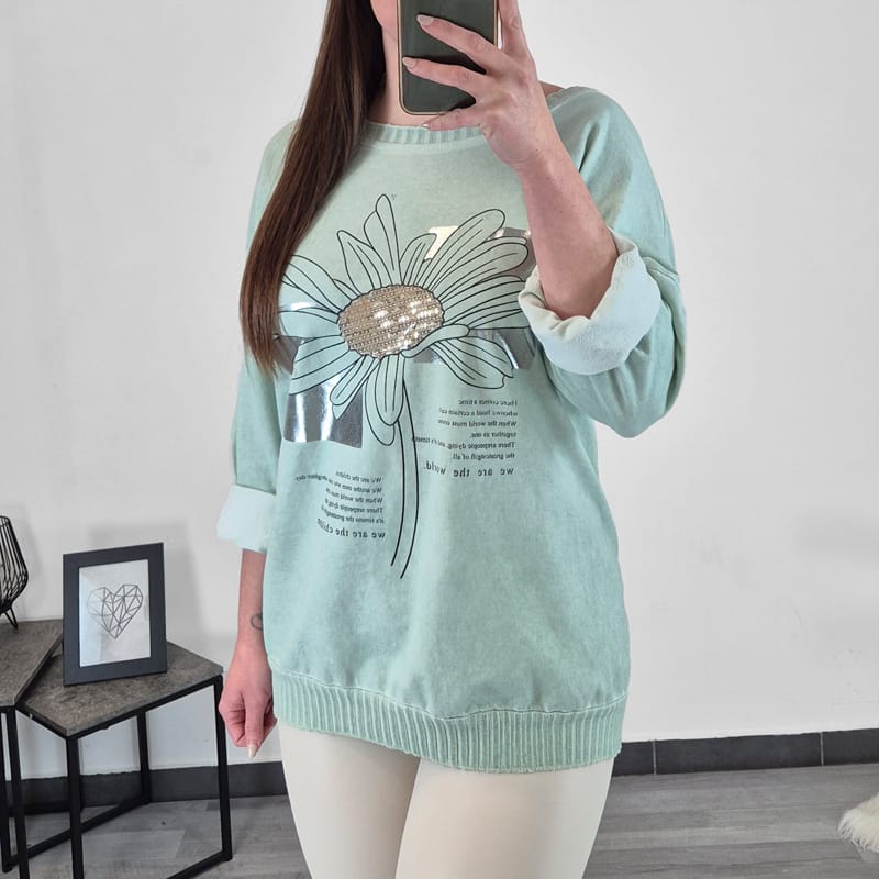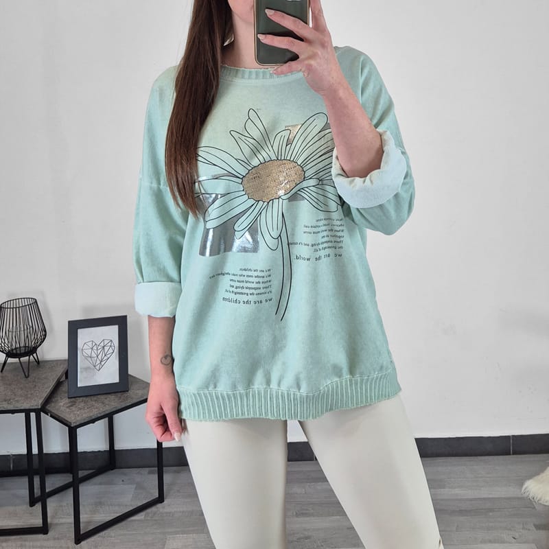 Modna ženska majica v mint zeleni barvi s tiskom. Majica ima dolga rokava s spuščenimi rameni. Na zadnji strani je podaljšana in lepo pokrije zadnjico. Na spodnji strani je dodan patent. Velikost je univerzalna, primerna za velikosti od L do 4XL