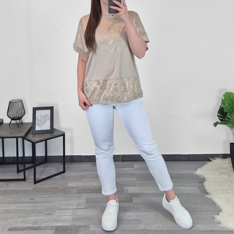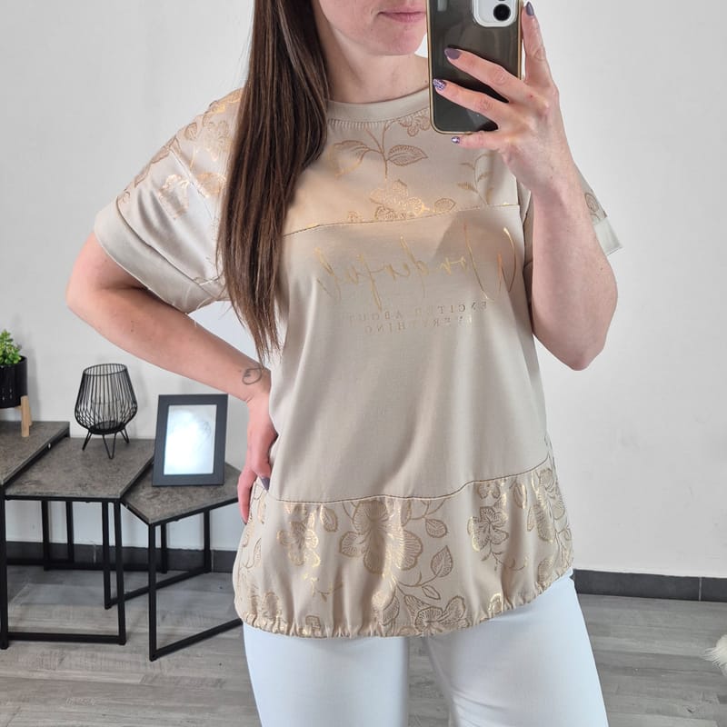 Ženska majica s kratkimi rokavi v bež barvi. Narejena je iz mešanice viskoze, zato je mehka na otip in lahka. Majica je iz enobarvnega blaga z zlatim potiskom. Kroj majice je širši, spodaj ima vrvico, s katero lahko prilagodite širino. Majica je univerzalne velikosti, primerna za M do 3XL.