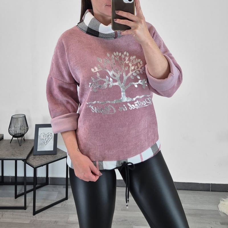 Ženska majica je izdelana iz kompaktnega rebrastega materiala, ima dolga rokava, ki jih lahko vihate po želji tudi v dolžino 3/4. Ima viseč ovratnik. Kroj majice je širši, na spodnjem delu ima vrvico, s katero majico oblikujete po svoji želji. Krasi jo tisk v srebrni barvi. Velikost je univerzalna, primerna za velikosti od L do 3XL.