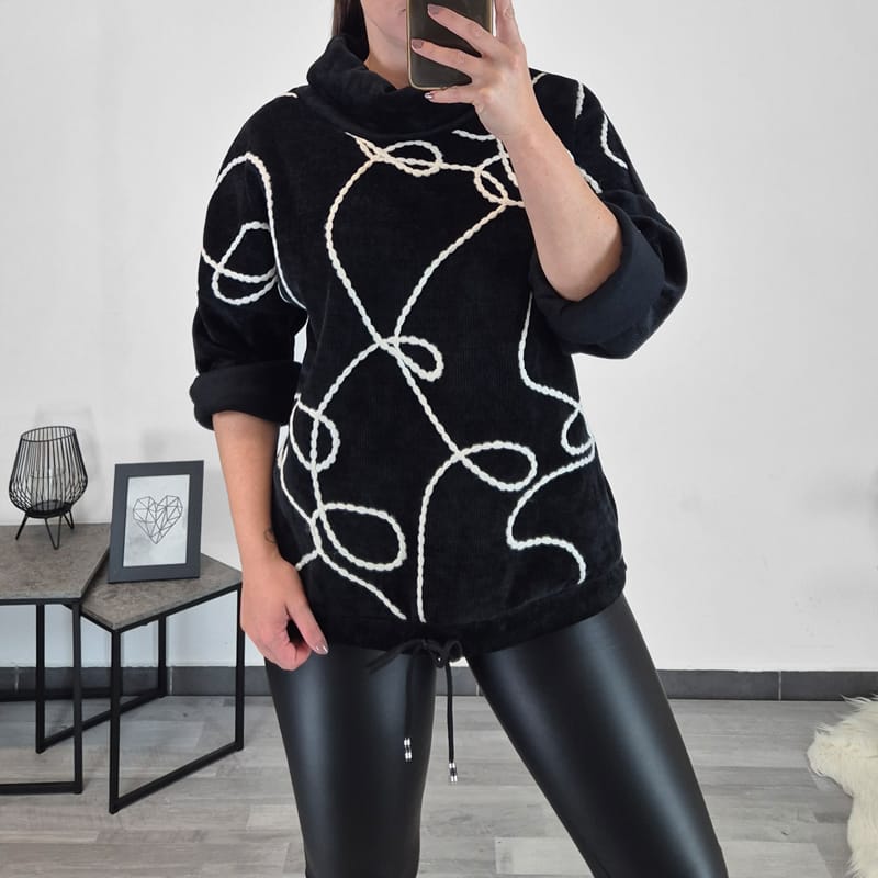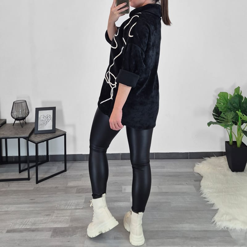 Ženska majica je izdelana iz kompaktnega rebrastega materiala, ima dolga rokava, ki jih lahko vihate po želji tudi v dolžino 3/4. Ima viseč ovratnik. Kroj majice je širši, na spodnjem delu ima vrvico, s katero majico oblikujete po svoji želji. Pulover je črne barve, na sprednjo stran je prišit bel trak, kar mu daje poseben izgled. Velikost je univerzalna, primerna za velikosti od L do 3XL.