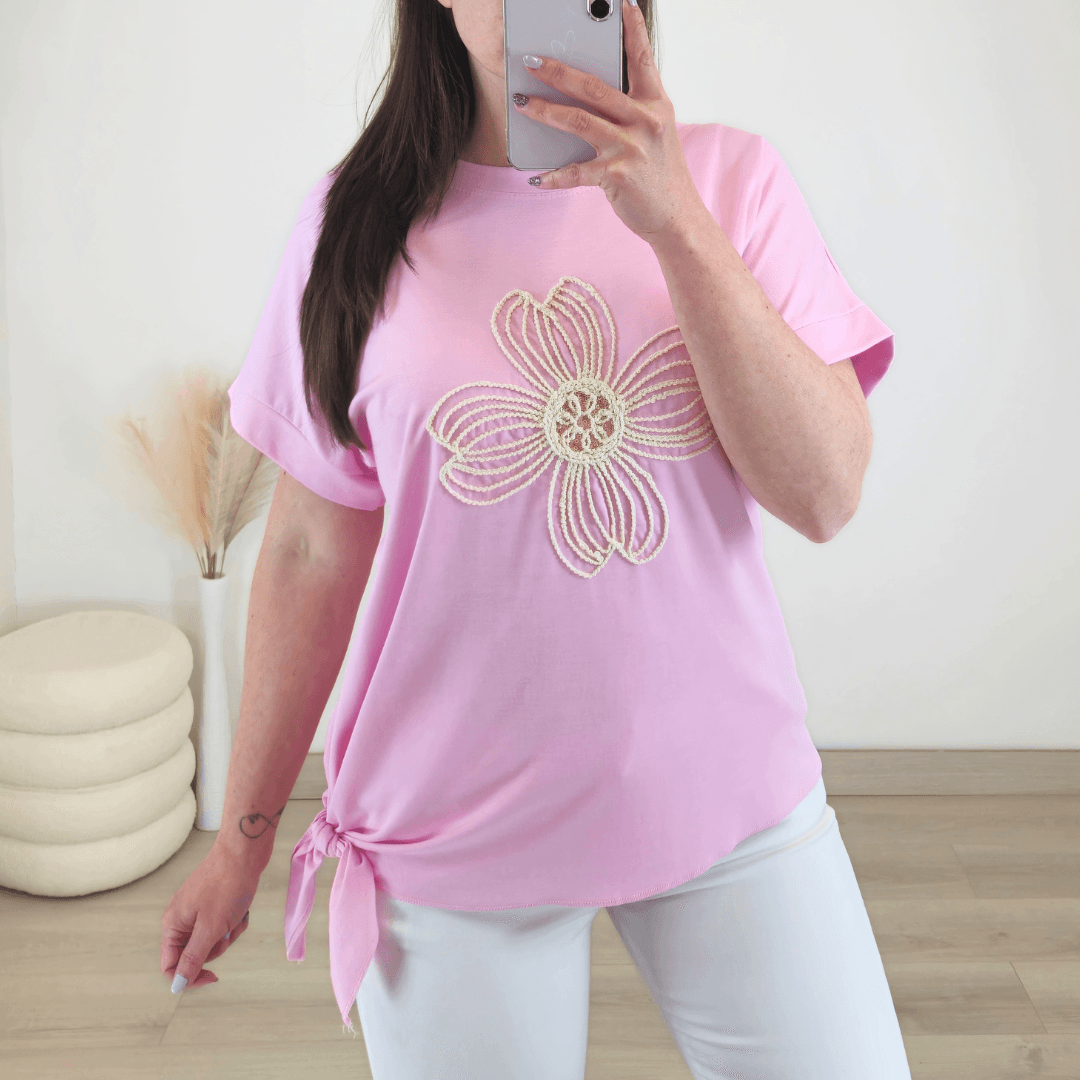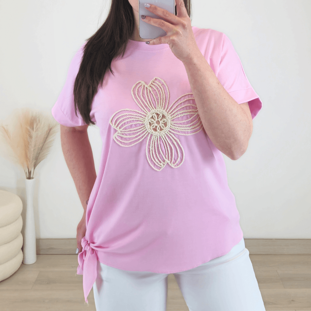 Ženska majica s kratkimi rokavi v roza barvi. Majica je izdelana iz mešanice viskoze in je prijetna za nošenje. Kroj je nekoliko daljši in širši, na sprednji strani ima vezenje v obliki rože. Majica se ob strani zaveže. Velikost je univerzalna, primerna za M do XXL.