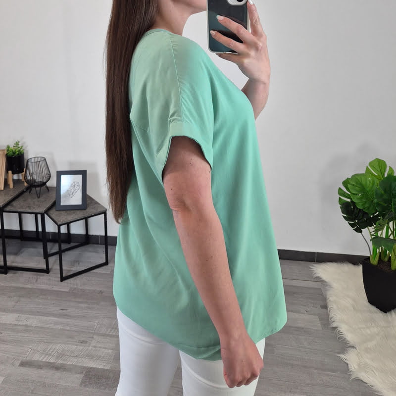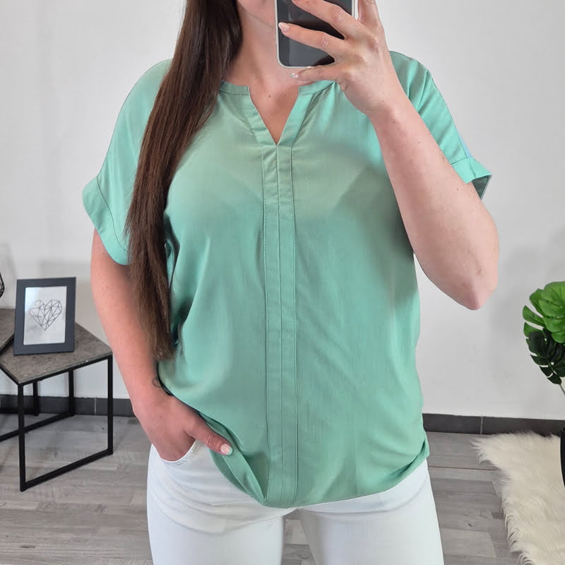 Ženska majica s kratkimi rokavi 16828 v zeleni barvi. Majica je brez ovratnika z “V” izrezom. Na zadnji strani ima prečni šiv v višini prsi in naborek. Narejena je iz kvalitetne viskoze, je zelo lahka in zračna. Majico boste odlično kombinirale s svojimi najljunšimi hlačami. Na voljo je od številke S do XXL.