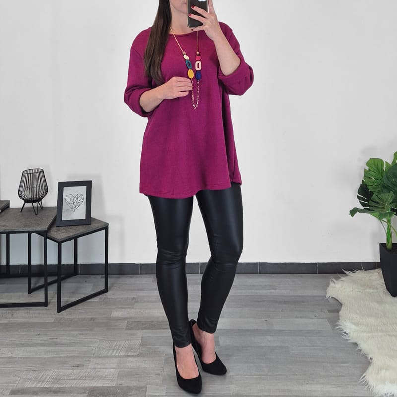 Ženska majica v roza barvi. Majica ima dolga rokava in je krojena rahlo navzven. Izdelana je iz toplejše viskoze in je primerna za hladnejše dni. Velikost je univerzalna, primerna za XL-4XL. Dodana je še verižica.