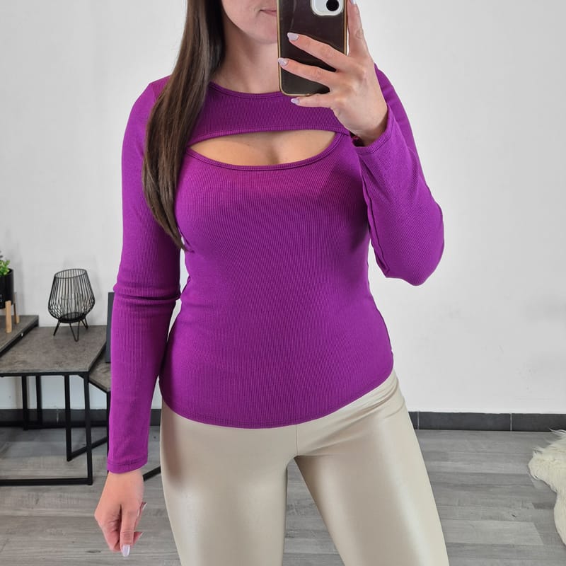 Modna ženska rebrasta majica v vijolični barvi. Majica ima dolga rokava in čudovit izrez na dekolteju. Izdelana je iz mešanice viskoze in je prijetna za nošenje. Velikost je univerzalna, primerna za S do L.