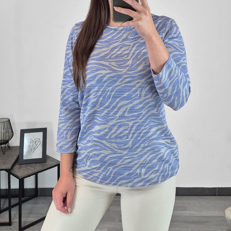 Ženska športno elegantna majica. Narejena je iz mešanice viskoze in je prijetna za nošenje. Kroj je širši, zaključi se s patentom, ki majico oblikuje. Ima 3/4rokava. Majica je narejena iz vzorčastega blaga v modri in bež kombinaciji.