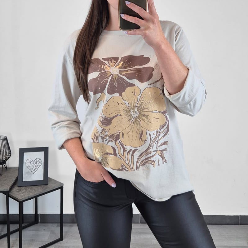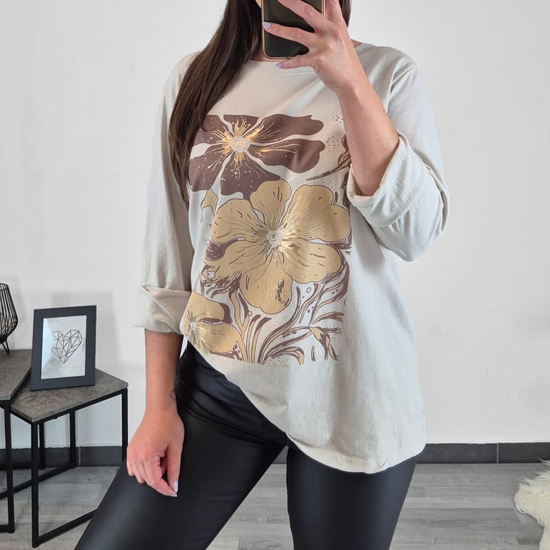 Ženska majica z dolgimi rokavi v bež barvi. Narejena je iz bombaža in je prijetna za nošenje. Kroj majice je širši, na sprednjem delu ima cvetlični tisk. Velikost je univerzalna, primerna za velikosti od M do XL.