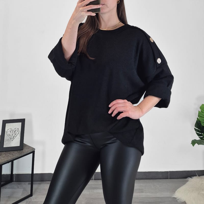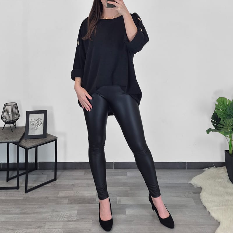 Ženska majica v črni barvi. Majica ima 3/4 rokava na metuljčka, krasijo jih srebrni gumbi. Izdelana je iz toplejše mešanice viskoze in je primerna za hladnejše dni. Velikost je univerzalna, primerna za 48 do 52.
