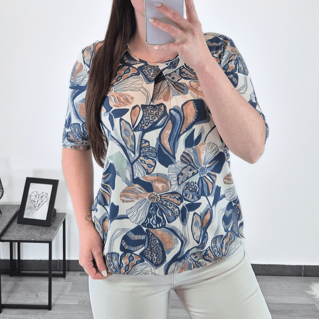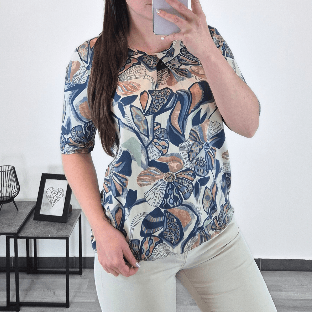 Ženska elegantna majica. Narejena je iz mešanice viskoze in je prijetna za nošenje. Kroj je širši, zaključi se s patentom, ki majico oblikuje. Rokava so kratka. Majica je narejena iz vzorčastega blaga v modri in bež kombinaciji. Na voljo od številke 36 do 52.