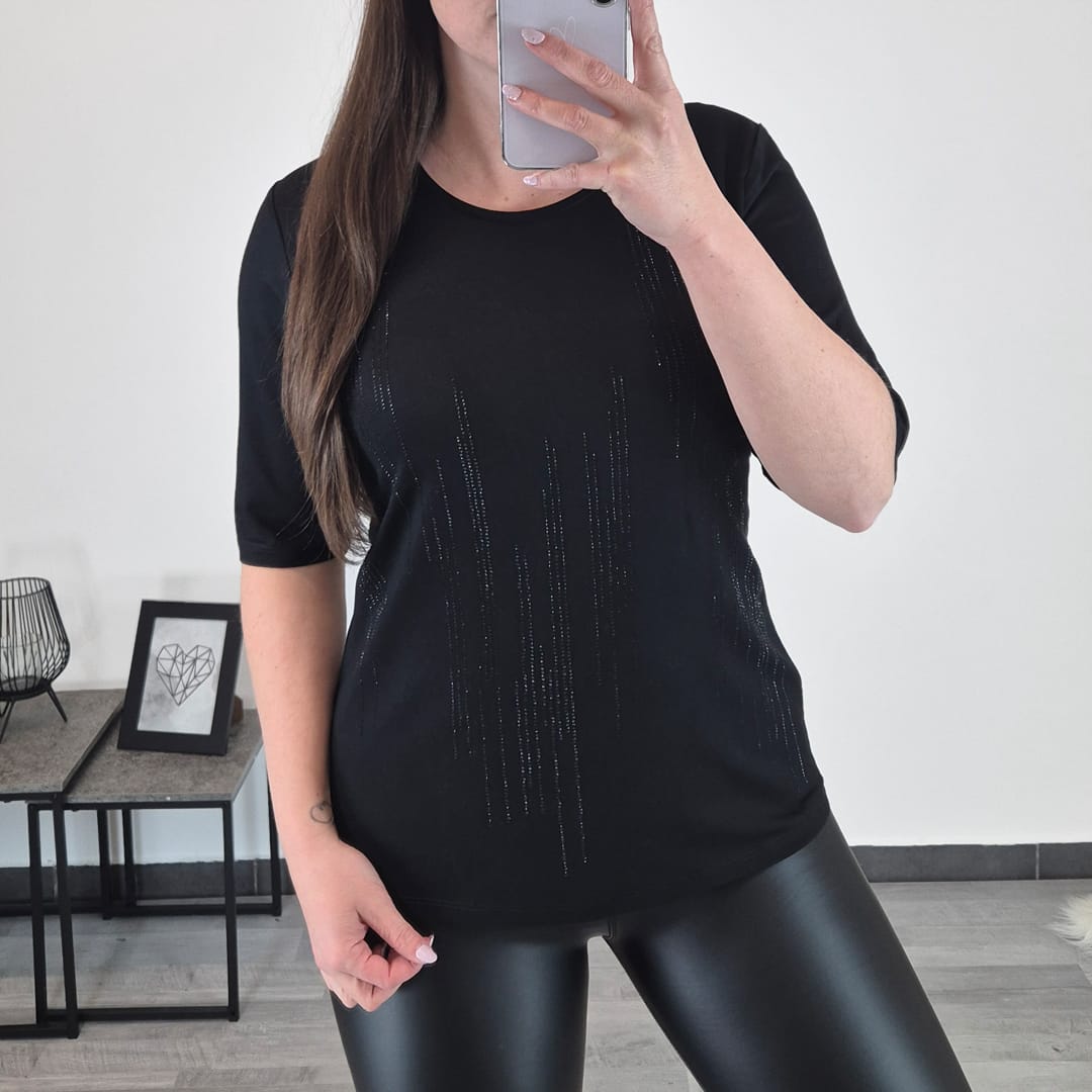 Ženska elegantna majica s kratkimi rokavi. Narejena je iz mešanice viskoze in je prijetna za nošenje. Majica je v črni barvi. Na sprednji strani ima dodane črne bleščice. Na voljo od številke 38 do 52.
