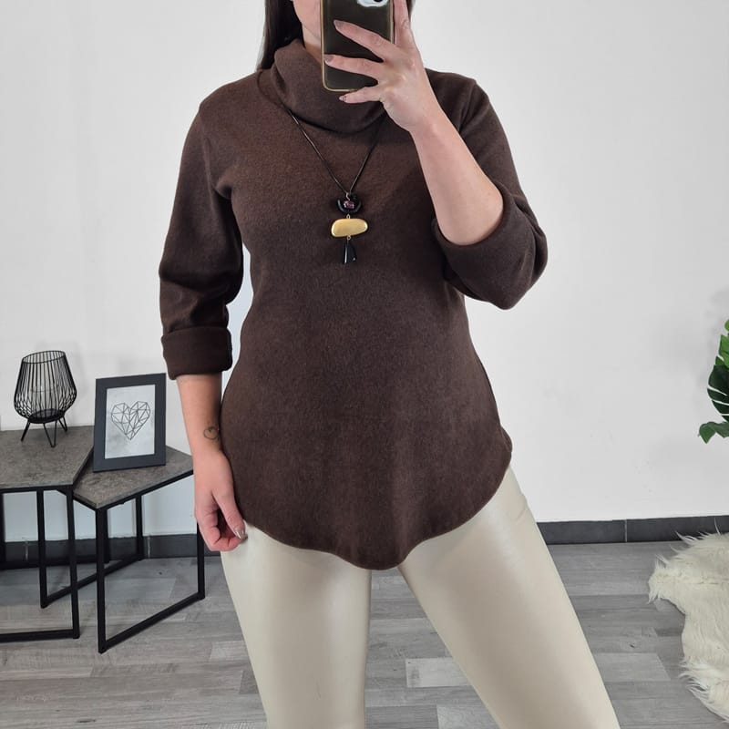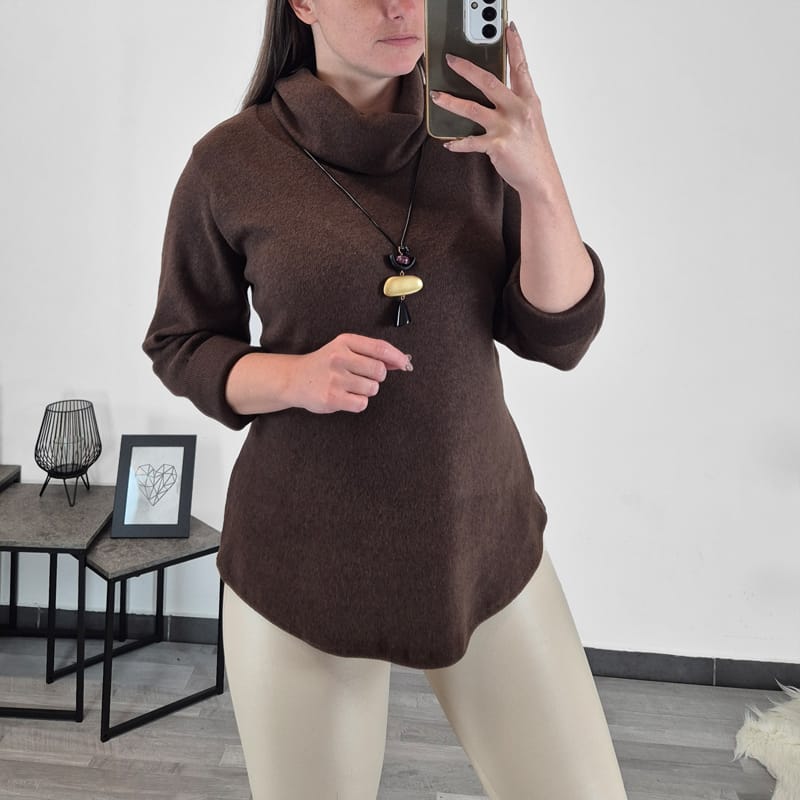 Ženska majica v rjavi barvi. Majica ima dolga rokava in visok ovratnik. Izdelana je iz toplejšega materiala in je primerna za hladnejše dni. Velikost je univerzalna, primerna za S-XL.
