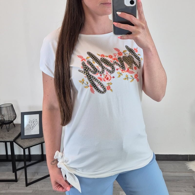 Ženska majica v beli barvi, na sprednji strani je dodan še tisk. Majica je malo podaljšana, ima kratka rokava, ob strani se zaveže. Izdelana je iz bombaža in je prijetna za nošenje.