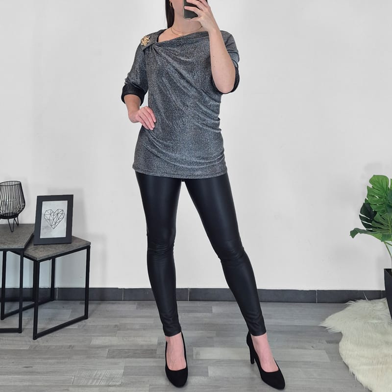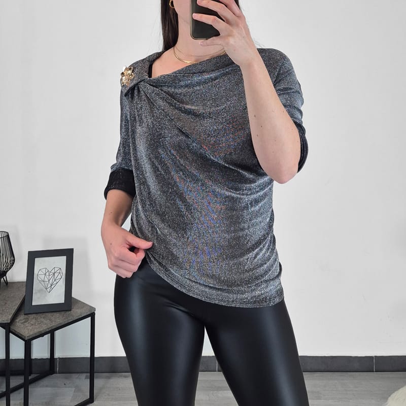 Elegantna ženska majica v srebrni barvi. Majica ima dolga rokava in spuščen ovratnik. Krasi jo zlata zaponka, kar ji daje posebno eleganten izgled. Izdelana je iz viskoze in je prijetna za nošenje. Velikost je univerzalna, primerna za 48 do 54.