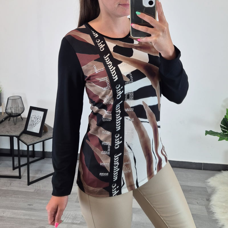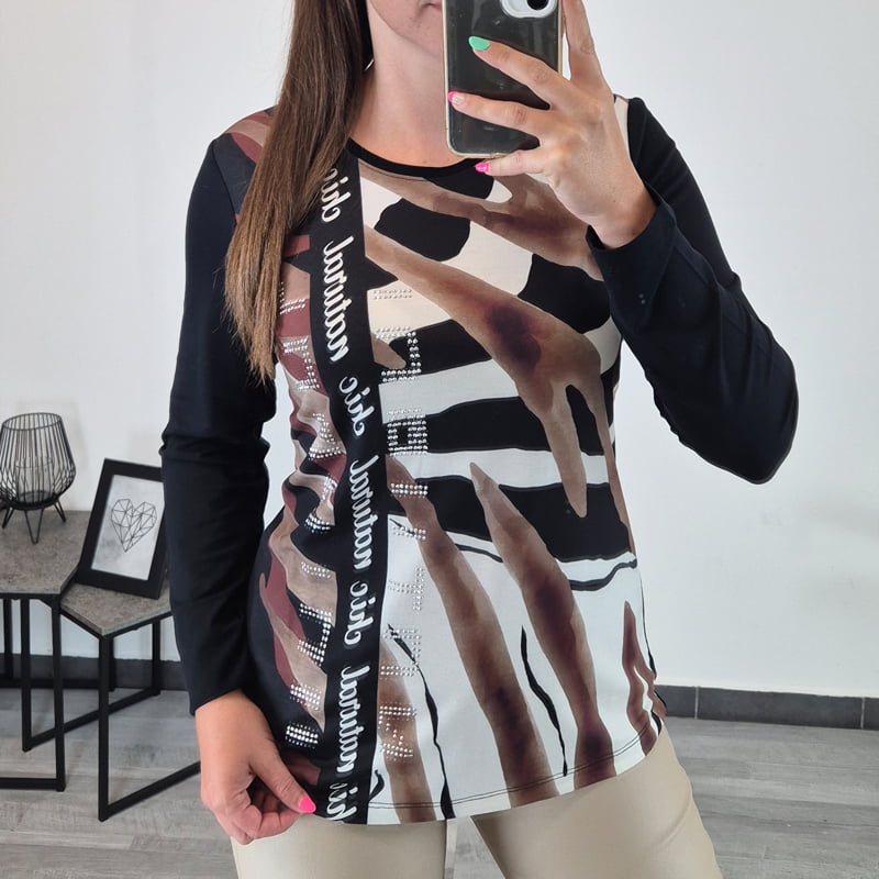 Ženska majica ima dolga rokava, na sprednji strani je narejena iz vzorčastega blaga v rjavi bež in črni barvi, krasijo jo še kamenčki. Rokava in hrbtni del pa so narejeni iz enobarvnega blaga v črni barvi.