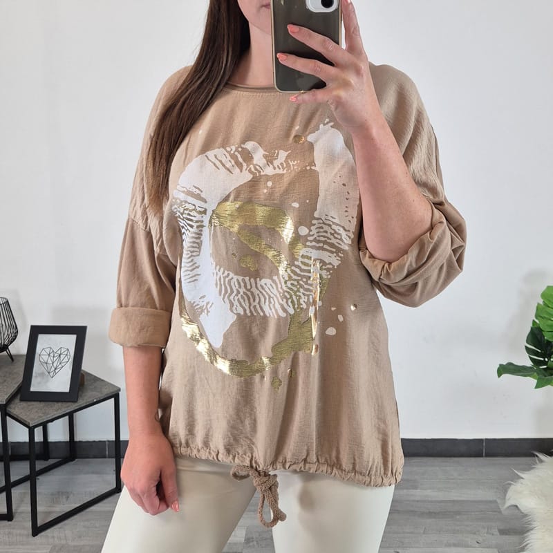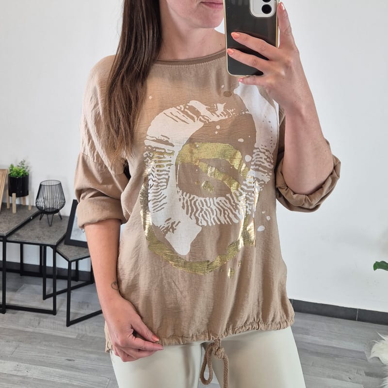 Ženska majica z dolgimi rokavi ali 3/4 rokavi, zavihate jih lahko po želji. Narejena je iz bombaža in viskoze in je prijetna za nošenje. Kroj majice je širši, na spodnjem delu ima vrvico s katero majico oblikujete. Spredaj ima aplikacijo v beli in zlati barvi. Velikost je univerzalna, primerna za velikosti od M do XXL.