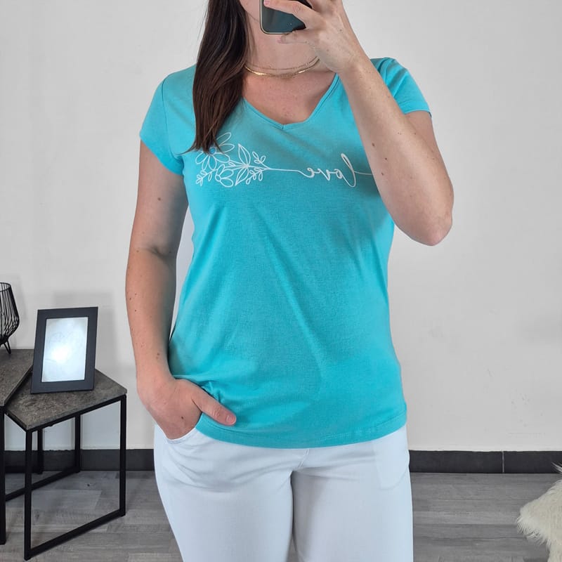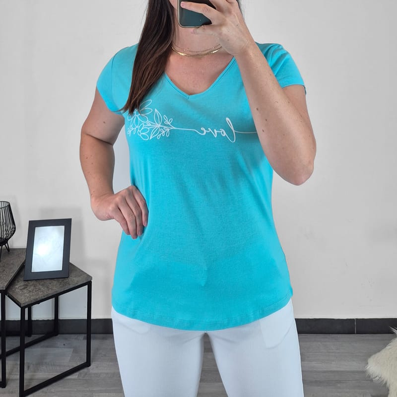 Ženska majica s kratkimi rokavi v modri barvi. Majica je izdelana iz 100% bombaža in je prijetna za nošenje. Spredaj je dodan tisk. Na voljo so velikosti od M do XXL.